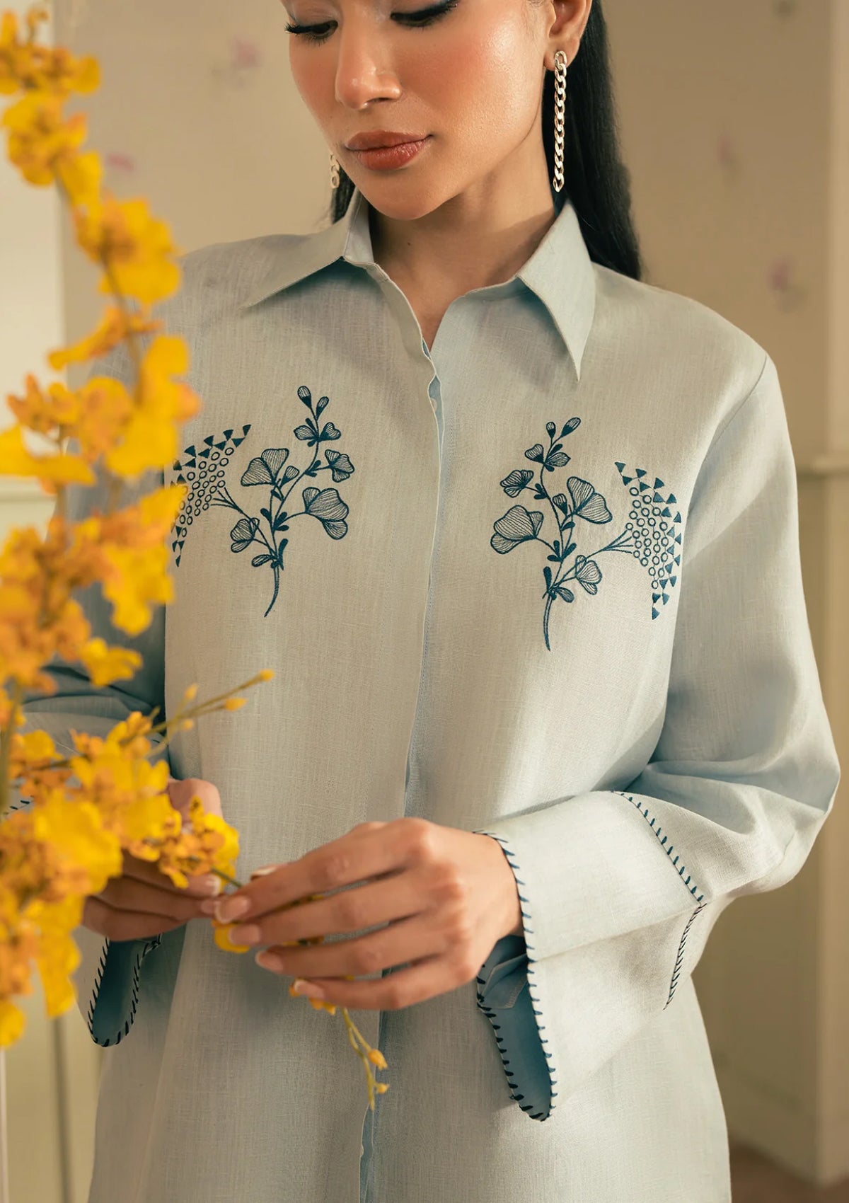 A short length button-up shirt featuring contemporary embroidery on the front and a classic shirt collar. The sleeves and pants are adorned with intricate detailing, paired with culottes for a stylish look.