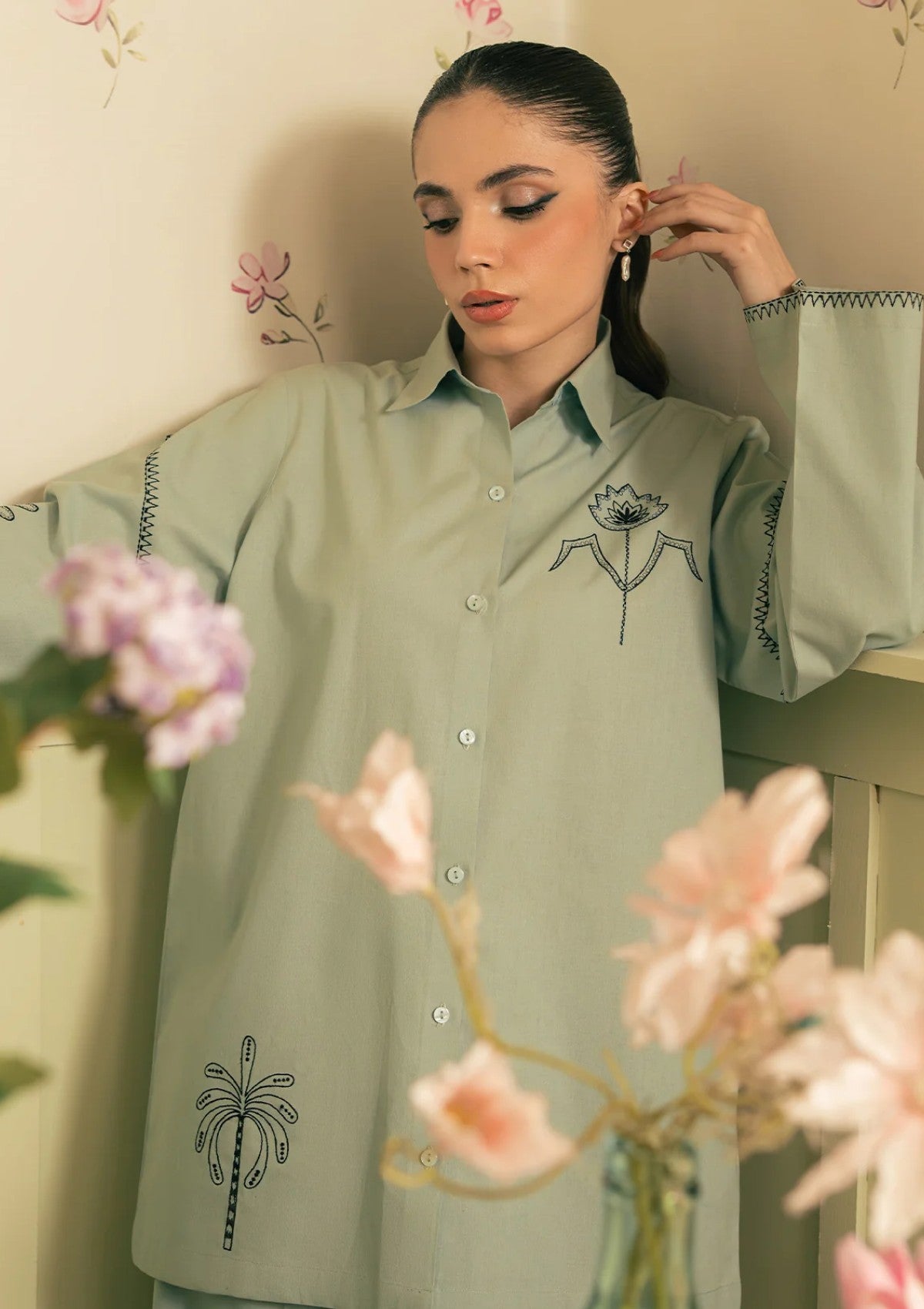 Button-up shirt featuring asymmetric embroidery, paired with culottes embroidered pants.