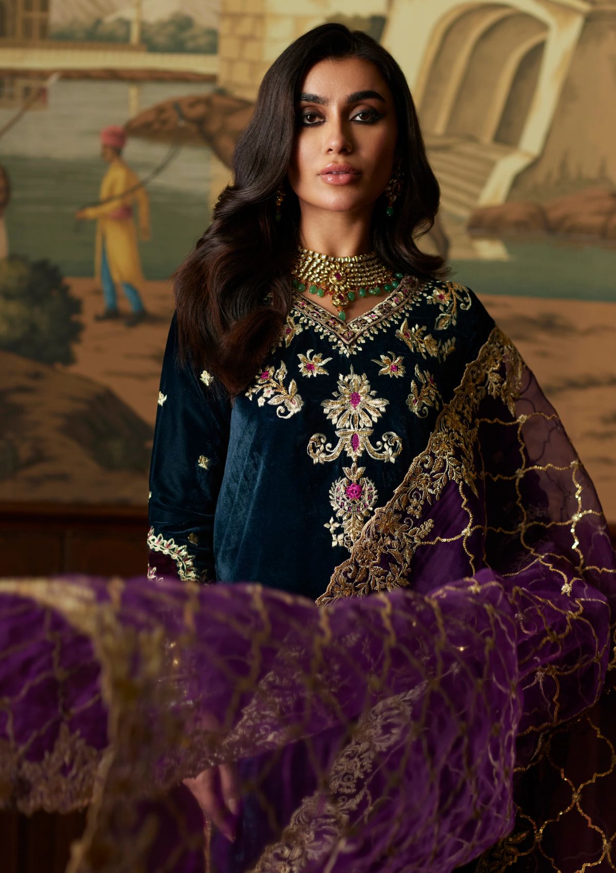 Perfect for the winter season! This luxe velvet straight shirt features French baroque inspired details on the neckline and sleeves. The outfit is completed with ajaar pants with complementing details and a contrasting dupatta with trellis sequin pattern and a floral border.