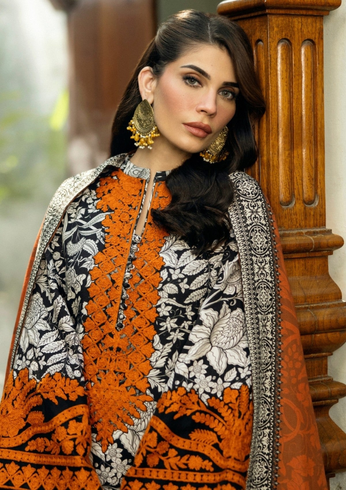 Exude timeless elegance with this exquisite unstitched ensemble. The striking black and white print forms a classic canvas, beautifully complemented by intricate rust-colored embroidery that graces the neckline and sleeves. The embroidery, inspired by vintage artistry, adds a rich depth and sophistication to the outfit. Perfect for creating bespoke designs, maintaining its luxurious appeal. this ensemble promises a seamless blend of tradition and modernity, making it a must-have for your wardrobe