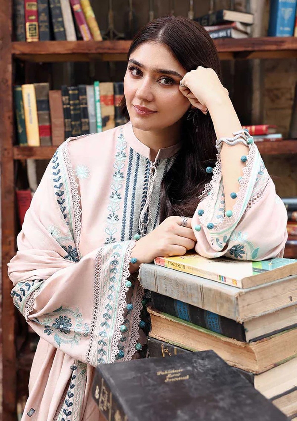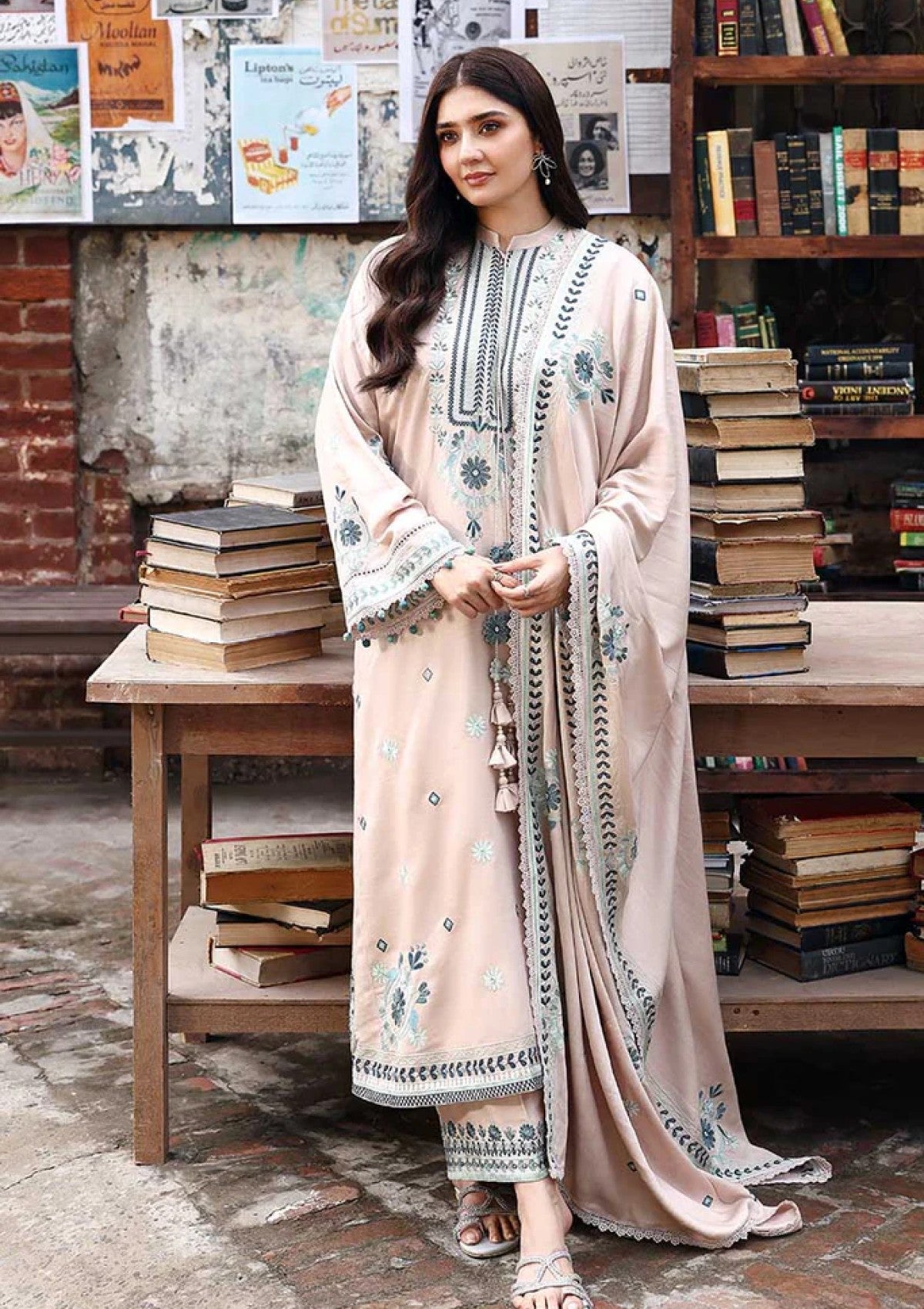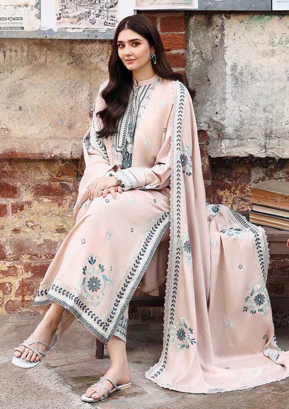 This Subtle Maze 3PC Marina Embroidered Suit features a finely detailed Marina embroidery adorning the front and sleeves of the shirt, paired with a dyed back for contrast. The hem and side slits are elegantly finished with an 80-inch embroidered patti, enhancing the overall design. Complemented by Marina embroidered trousers and a matching embroidered dupatta, this suit offers a cohesive and refined ensemble perfect for formal occasions or festive wear.