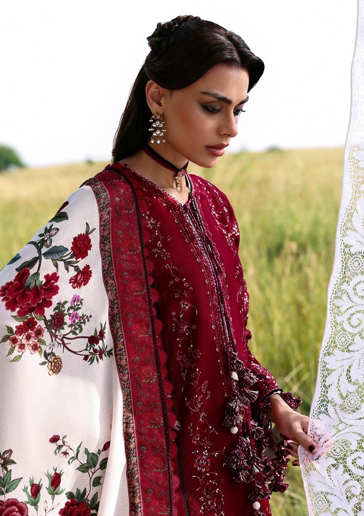Embrace the charm of the season with this deep red long khaddar shirt, beautifully adorned with delicate floral embroidery on side panels and hem. The stylish sleeves and embroidered culotte border add a touch of sophistication, perfectly paired with a wool-composed printed offwhite contrast shawl featuring traditional borders and refined printed facings. A timeless blend of warmth, grace, and heritage — made to make every winter moment stunning