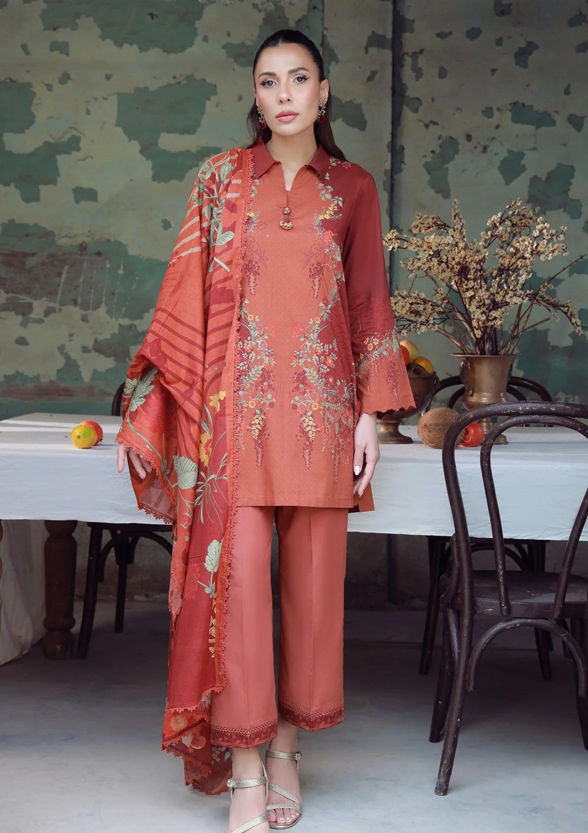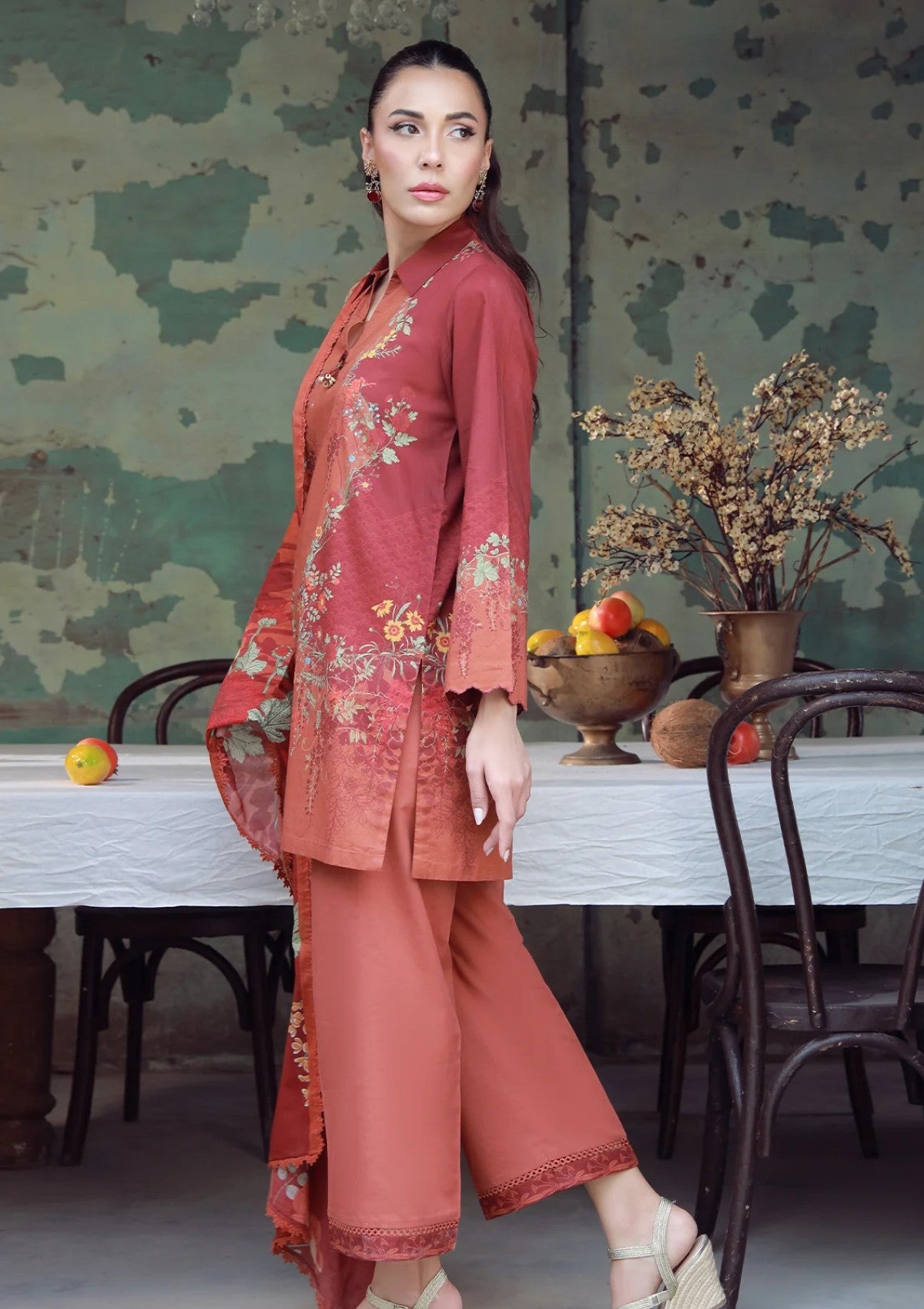 This elegant three-piece ensemble is crafted in warm terracotta tones, adorned with delicate pastel floral patterns for a refreshing charm. The straight-cut kurta is detailed with intricate prints, paired with solid trousers finished with lace edging for a refined touch. A complementing printed dupatta, featuring botanical motifs in earthy hues, completes the look—an effortless fusion of tradition and modern sophistication.