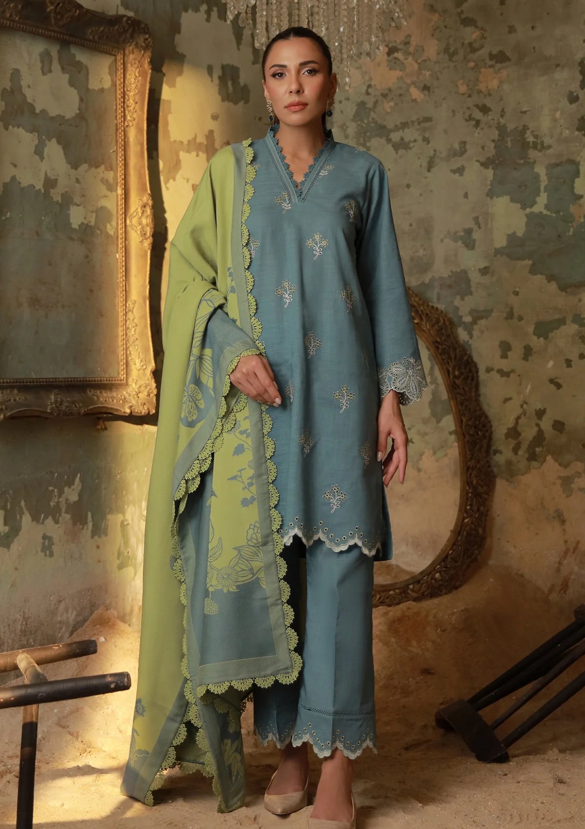 A light blue outfit adorned with contrast green and white floral eyelet embroidery, offering a soft, refreshing appeal. Paired with a green and blue asymmetric floral shawl, the look is effortlessly elegant with a touch of natural charm.