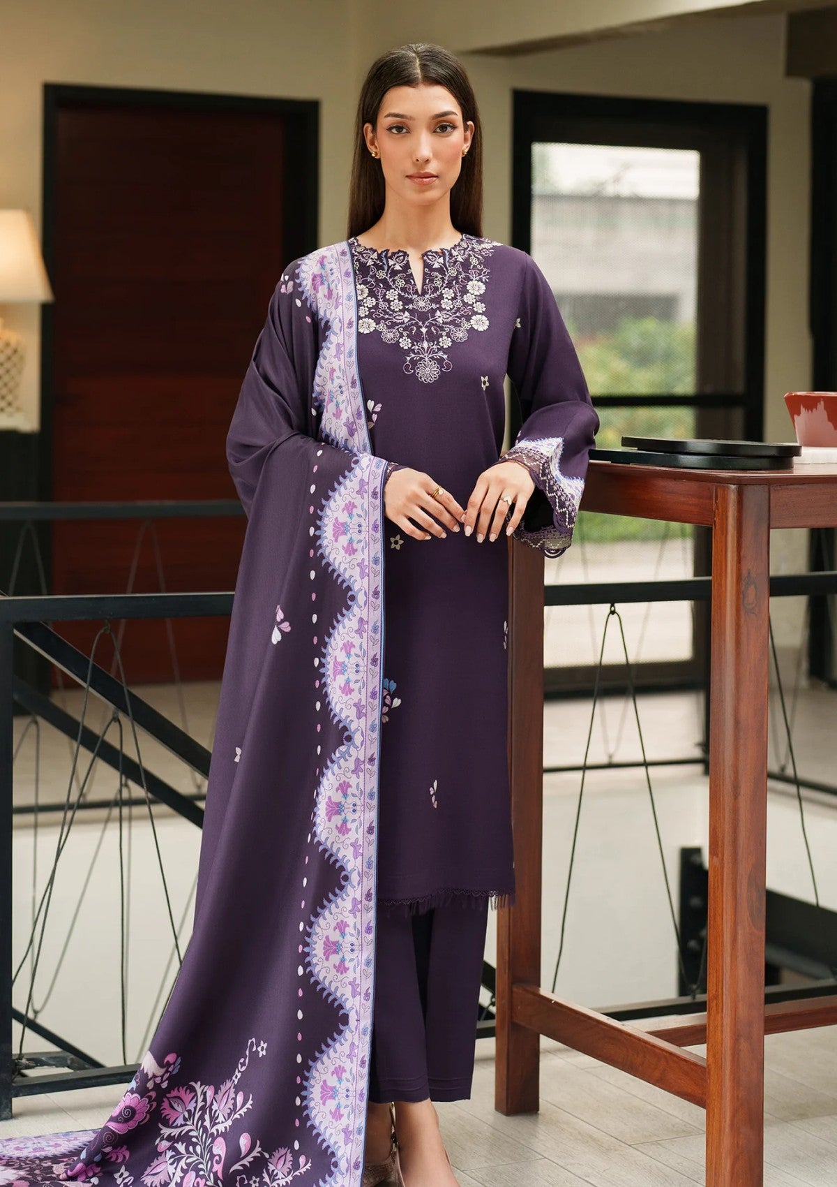 Amyra embodies timeless charm in a purple hue, crafted from luxurious slub viscose for an effortlessly graceful appeal. The shirt features refined embroidery along the neckline and sleeves, where delicate threadwork and floral motifs create subtle artistry. Paired with coordinating plain trousers and a printed blended shawl in complementary tones, this three piece ensemble radiates understated sophistication and poise.