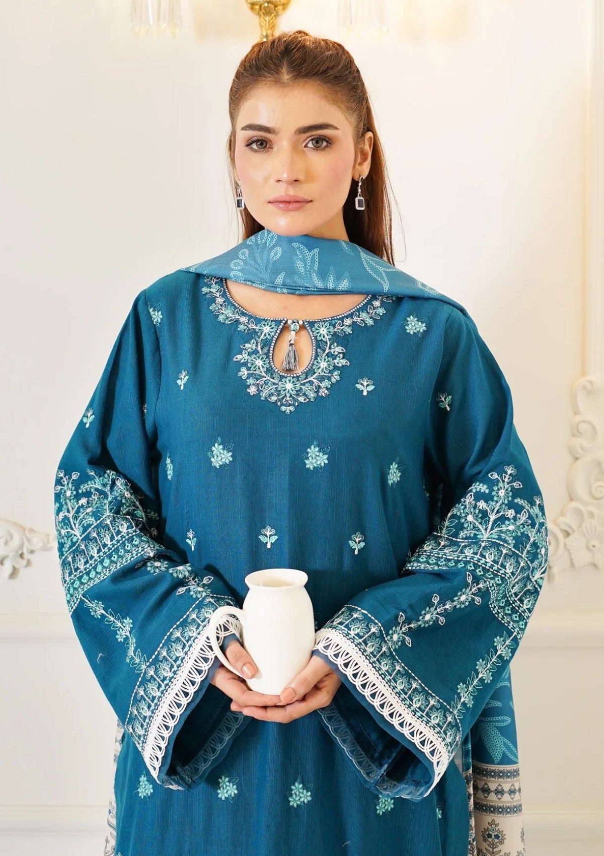 A refined winter look in a striking teal base, this khaddar outfit is tastefully adorned with embroidery in soft off-white and tonal teal shades. The shirt features an elegantly embroidered neckline that draws the eye, while borders and sleeves are accentuated with intricate floral detailing. Clean lines and graceful motifs give this ensemble a fresh yet traditional appeal. Paired with plain khaddar trousers and a complementing wool shawl, this outfit balances cozy warmth with sophisticated style, making it a versatile choice for seasonal gatherings.