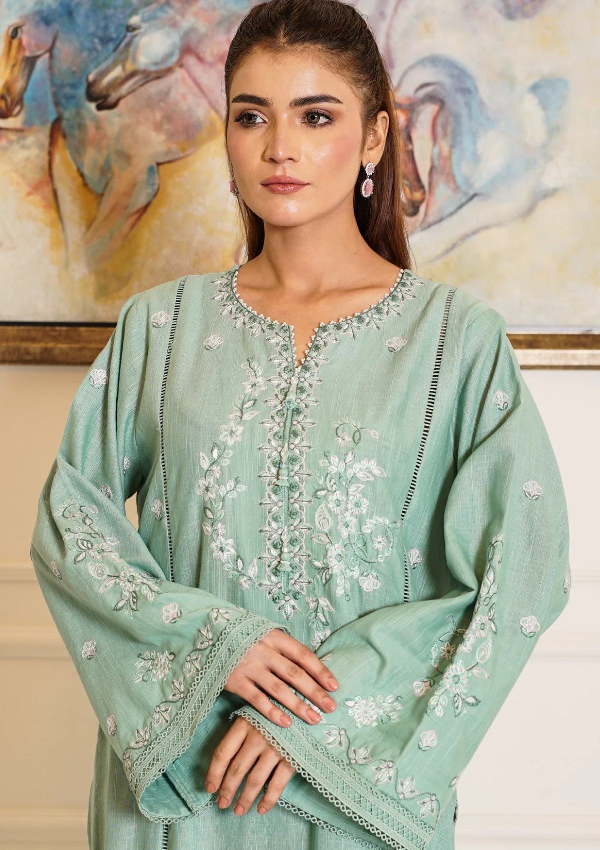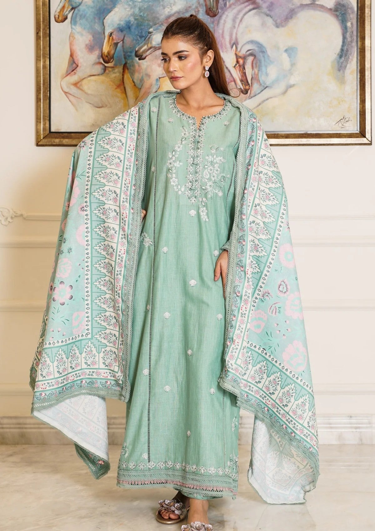 This soft sage green khaddar outfit is delicately adorned with embroidery in soothing shades of green, pink, and off-white. The shirt features an embroidered neckline that adds elegance, while finely crafted borders highlight the ghera for a graceful flow. Coordinating embroidered borders for the trousers complete the refined look, giving the ensemble a cohesive and polished finish. Paired with a printed wool shawl, this outfit blends gentle colors with intricate detailing — a perfect balance of comfort and sophistication for the winter season.
