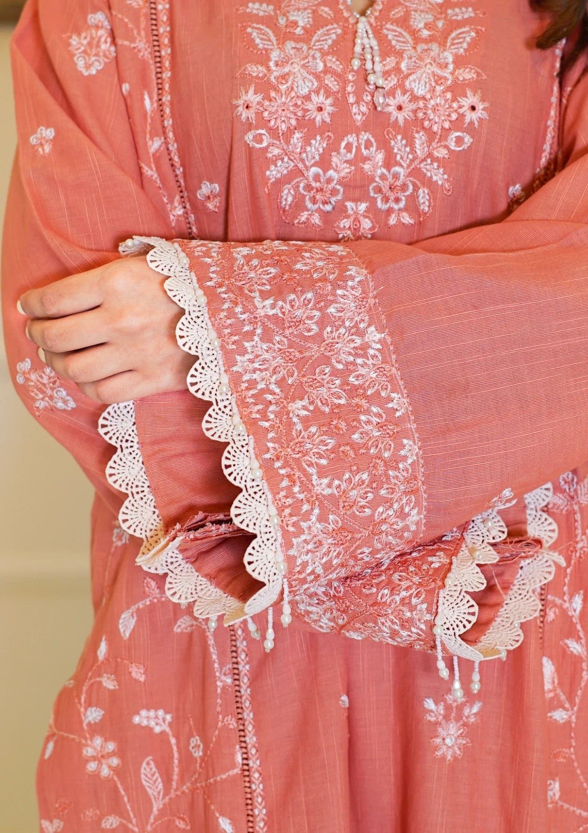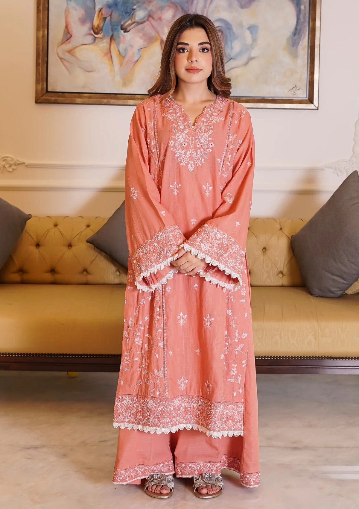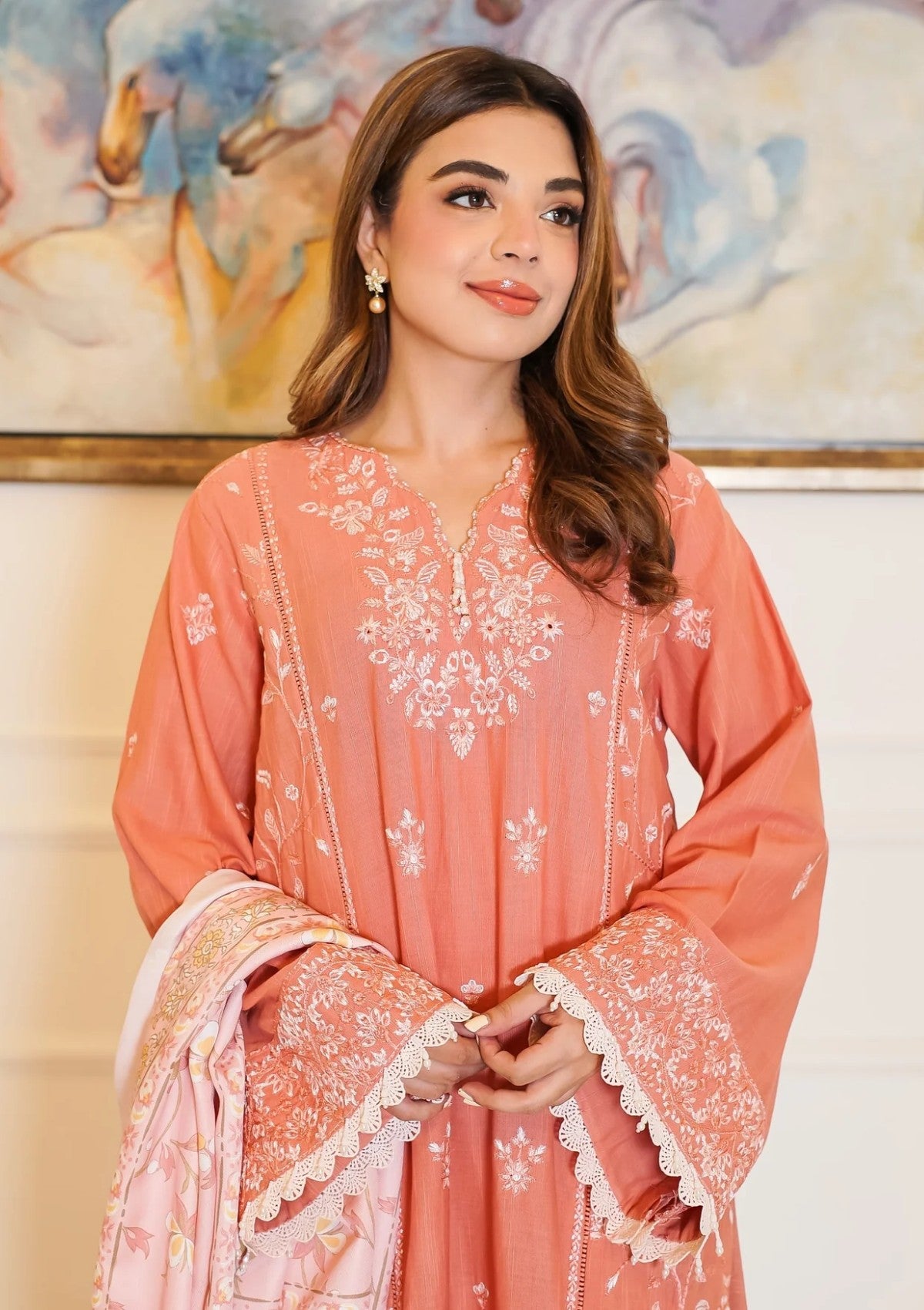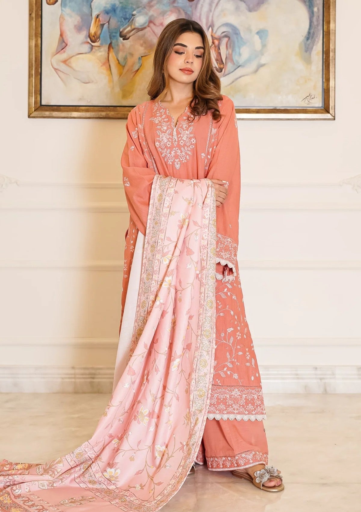 Elevate your winter wardrobe with this elegant dusty peach khaddar outfit, adorned with delicate white embroidery that brings a soft, graceful charm to your look. The shirt features intricate floral embroidery on the neckline, front panels and sleeves. The thick khaddar fabric ensures warmth and comfort, making it ideal for colder days. Paired with matching khaddar trousers and a cozy wool shawl, this ensemble blends seasonal practicality with timeless sophistication—perfect for both casual gatherings and festive occasions.