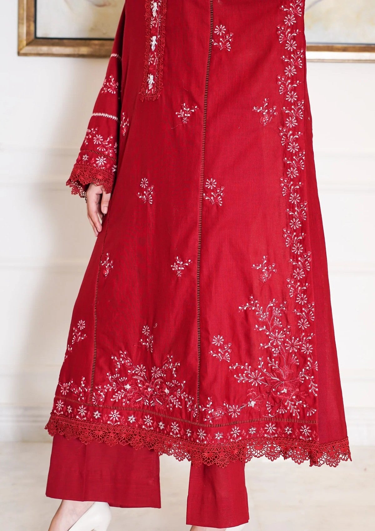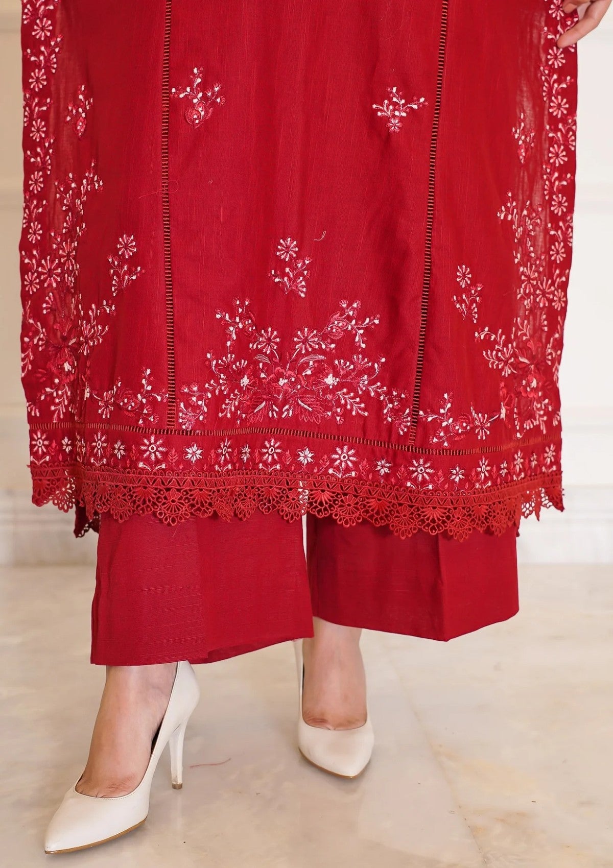 This deep maroon khaddar ensemble is a graceful winter essential, elevated with delicate floral embroidery in soft off-white and matching maroon tones. The shirt features a finely detailed neckline, complemented by scattered floral sprays that bring a touch of elegance across the front and sleeves. A richly embroidered floral border along the hemline adds refinement and completes the look. Styled with plain khaddar trousers and a warm wool shawl, this outfit blends seasonal comfort with understated sophistication — making it perfect for both everyday wear and special occasions