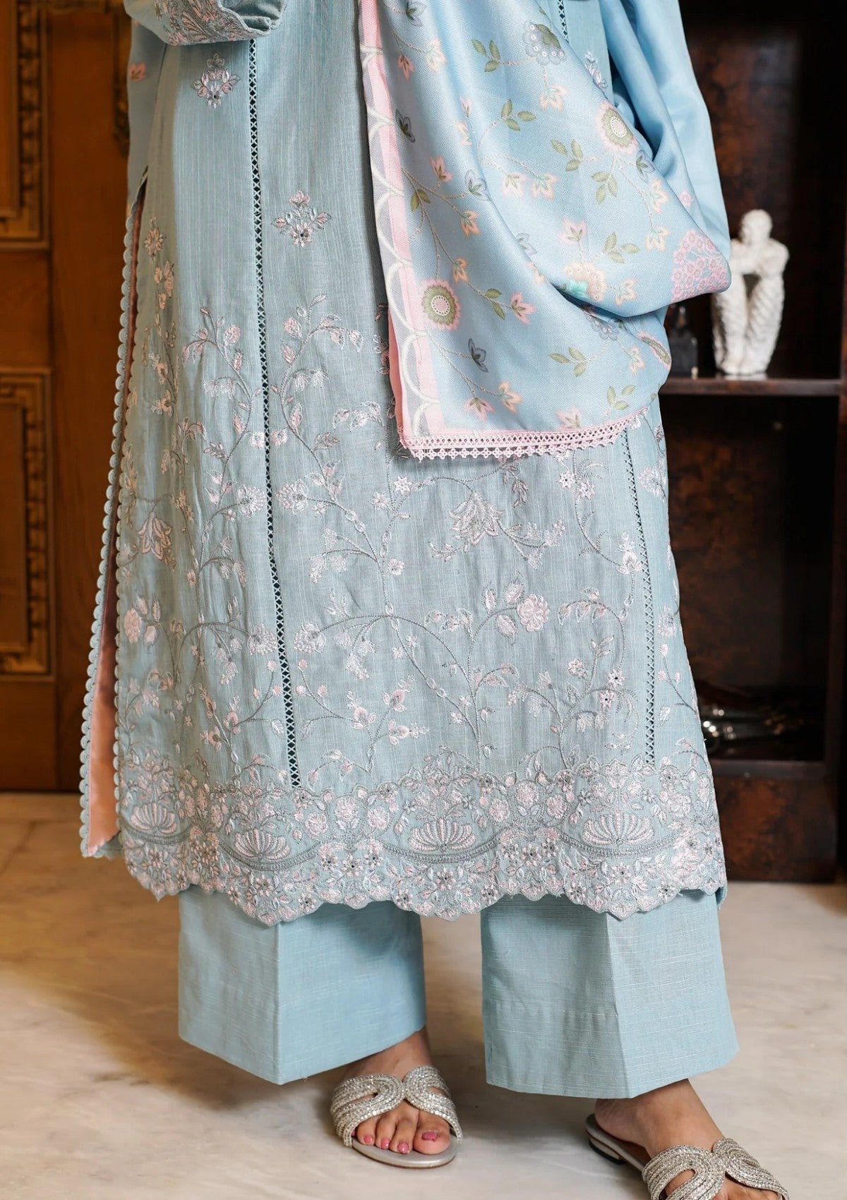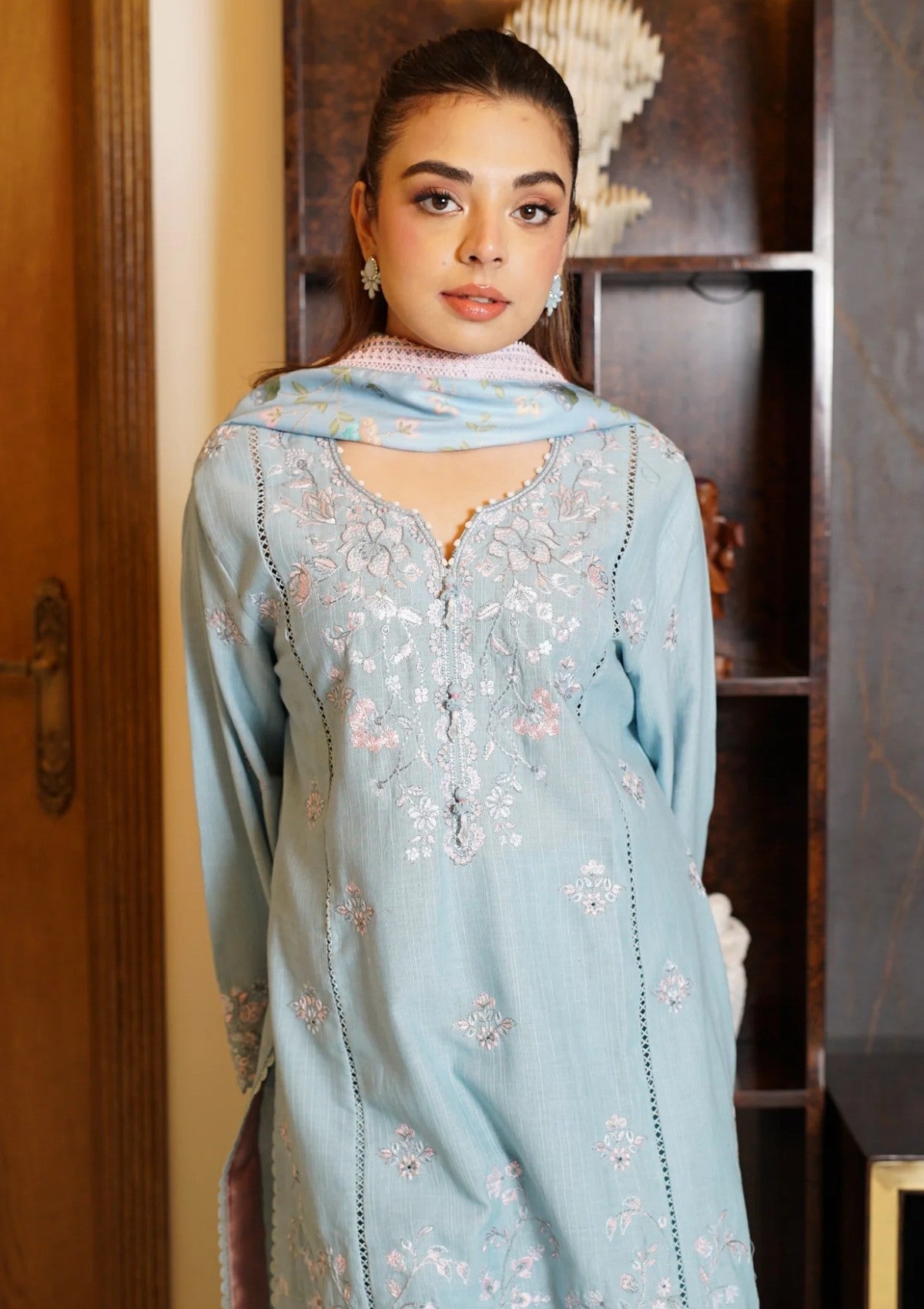 This refreshing light blue khaddar outfit is beautifully enhanced with embroidery in delicate shades of pink, blue, and off-white. The shirt features an intricately embroidered neckline, complemented by embroidered sleeves that add elegance and charm. Finishing off the look, embroidered khaddar borders along the hemline lend a graceful structure to the design. Paired with plain khaddar trousers and a warm wool shawl, this ensemble blends soft winter hues with refined craftsmanship — perfect for seasonal gatherings and festive wear.