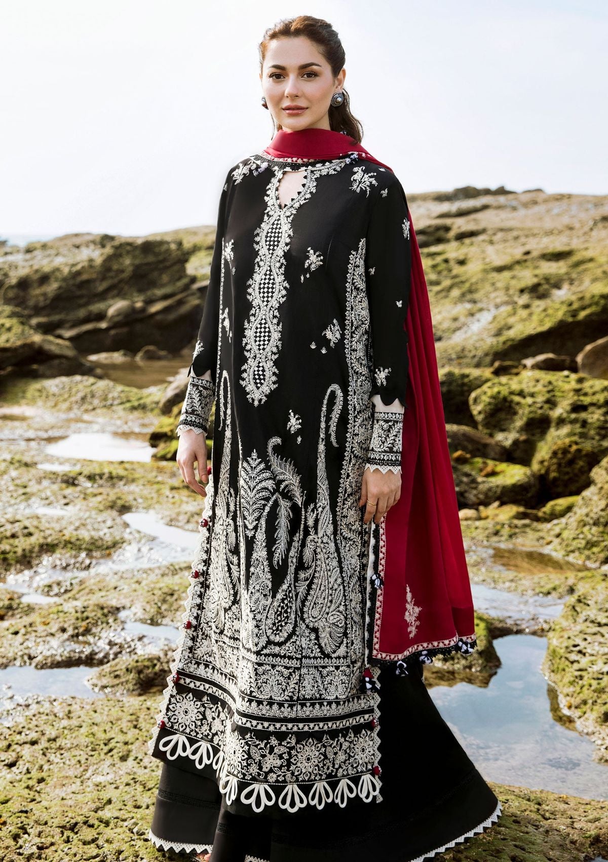 Description: An ornate and elaborate Kashmiri design in sooty obsidian layered with celestial ivory embroideries makes an exquisite composition in ‘Iskele.’ A beautifully embroidered tapestry is thoughtfully crafted using the most detailed and delicate taankas in the style and quality of handworked kashmiri textiles. A vibrant scarlet, Swiss voile dupatta laga red with intricately embroidered motifs completes this exquisitely regal look.