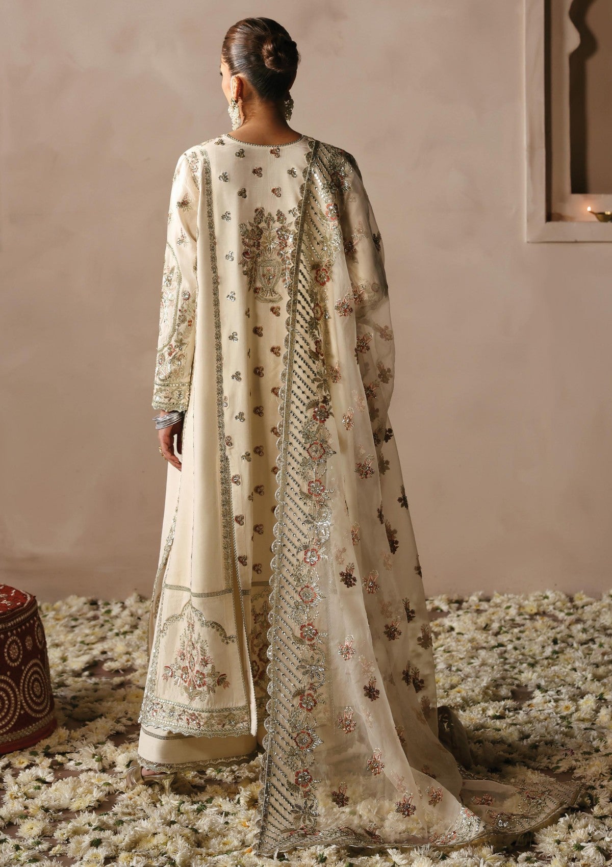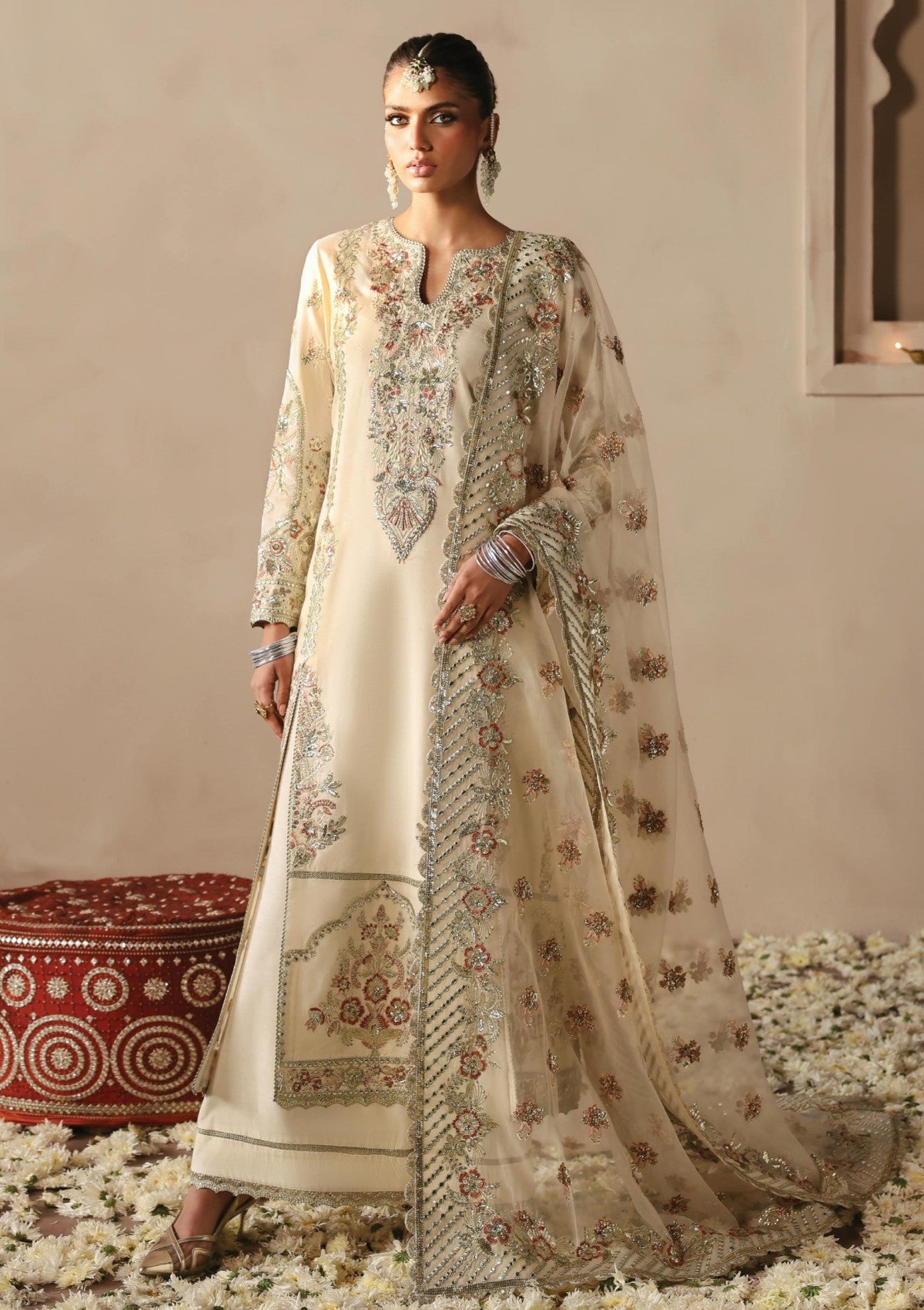 This luxurious outfit features a raw silk base paired with a sheer organza dupatta adorned with intricate embroidery on all four sides. The shirt showcases a timeless design with left and right panels embellished in golden panni, light gold tilla work, and delicate sequins, creating a dazzling interplay of textures. The back of the shirt is adorned with artistic motifs, while the embroidered sleeves and mihrab-inspired border add a touch of traditional charm. Completing the look is a pair of plain trousers, offering a minimalistic balance to the ornate ensemble.