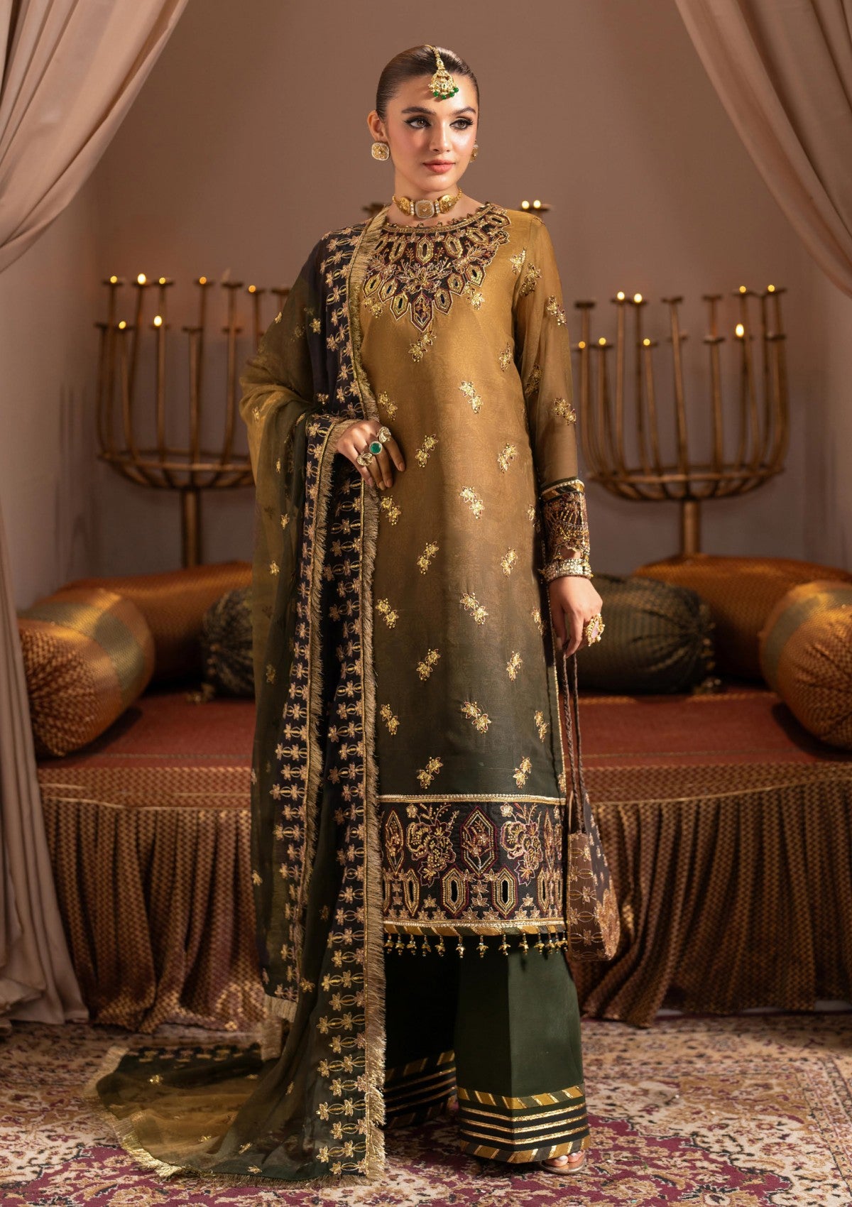 Zabreen is a captivating ensemble that blends ochre yellow and dark green on lightweight chiffon fabric. It features delicate threadwork and motifs on the neckline and hem, paired with tonal raw silk trousers. This outfit is designed to shine on any occasion.
