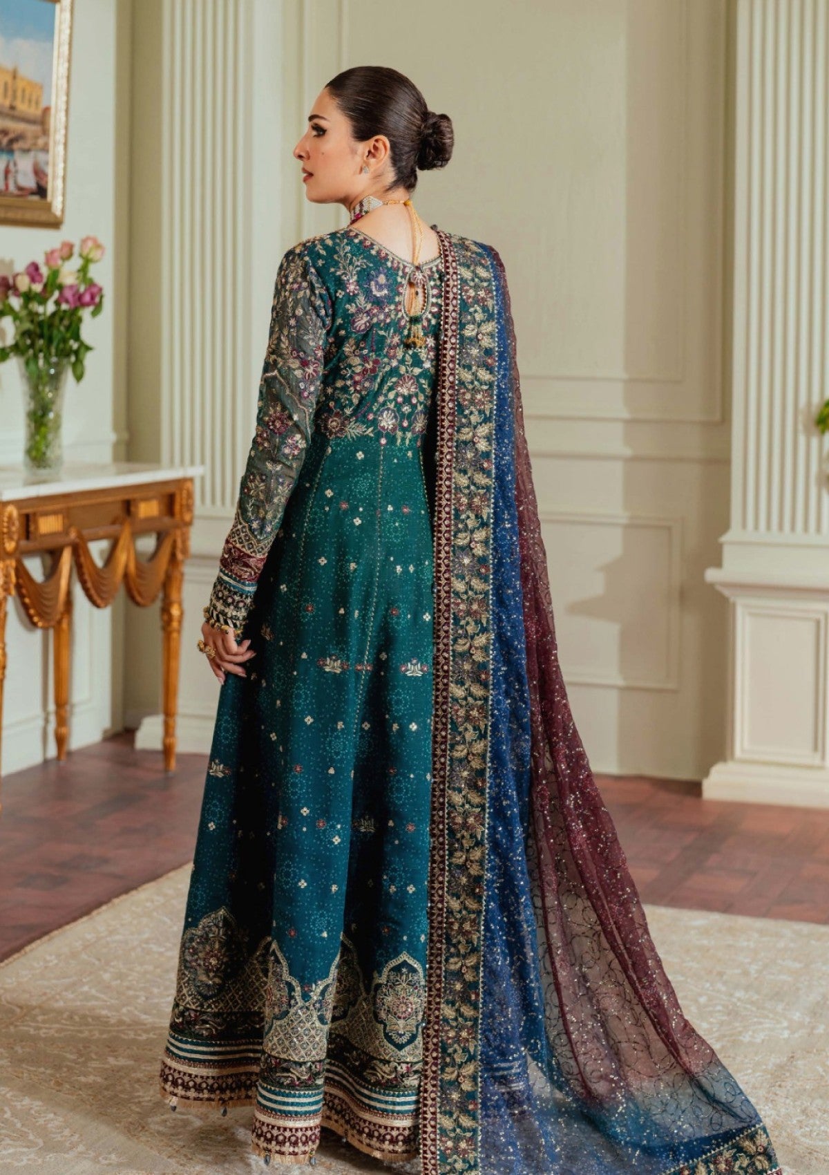 A printed chiffon dupatta adorned with sequins and threadwork include embroidered organza and velvet border to match the aesthetic of the ensemble, enhancing its luxury.