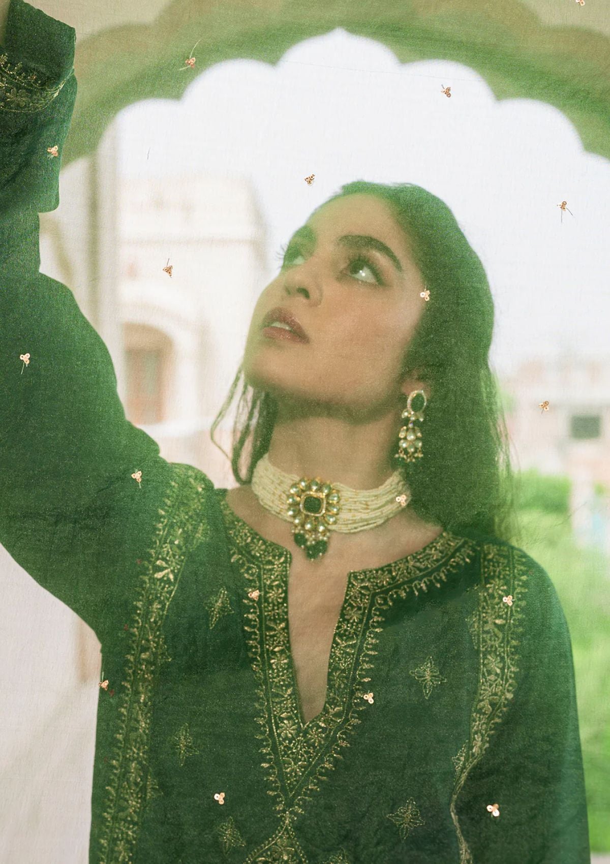 • The embroidered back motif on organza and an ethereal organza dupatta