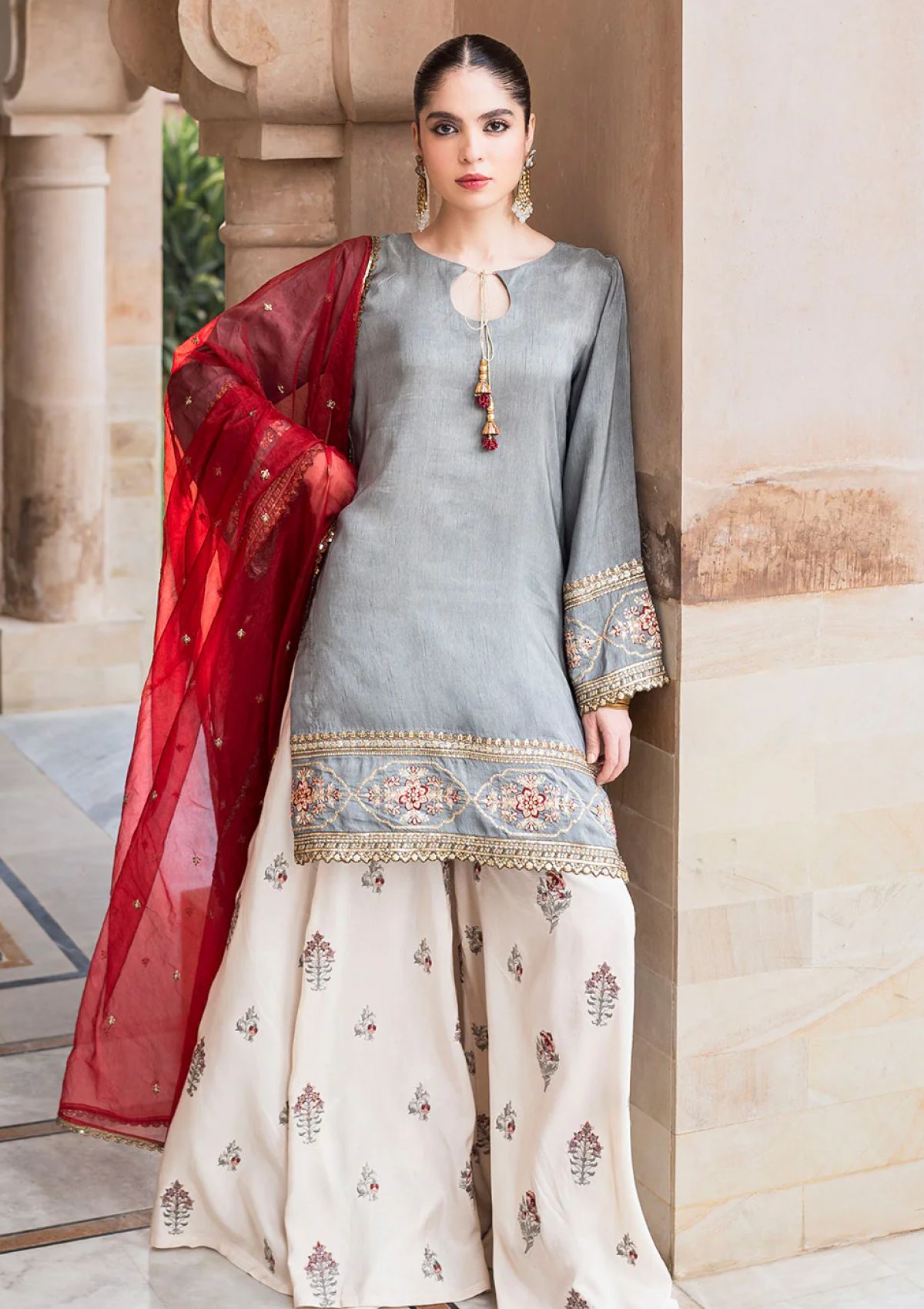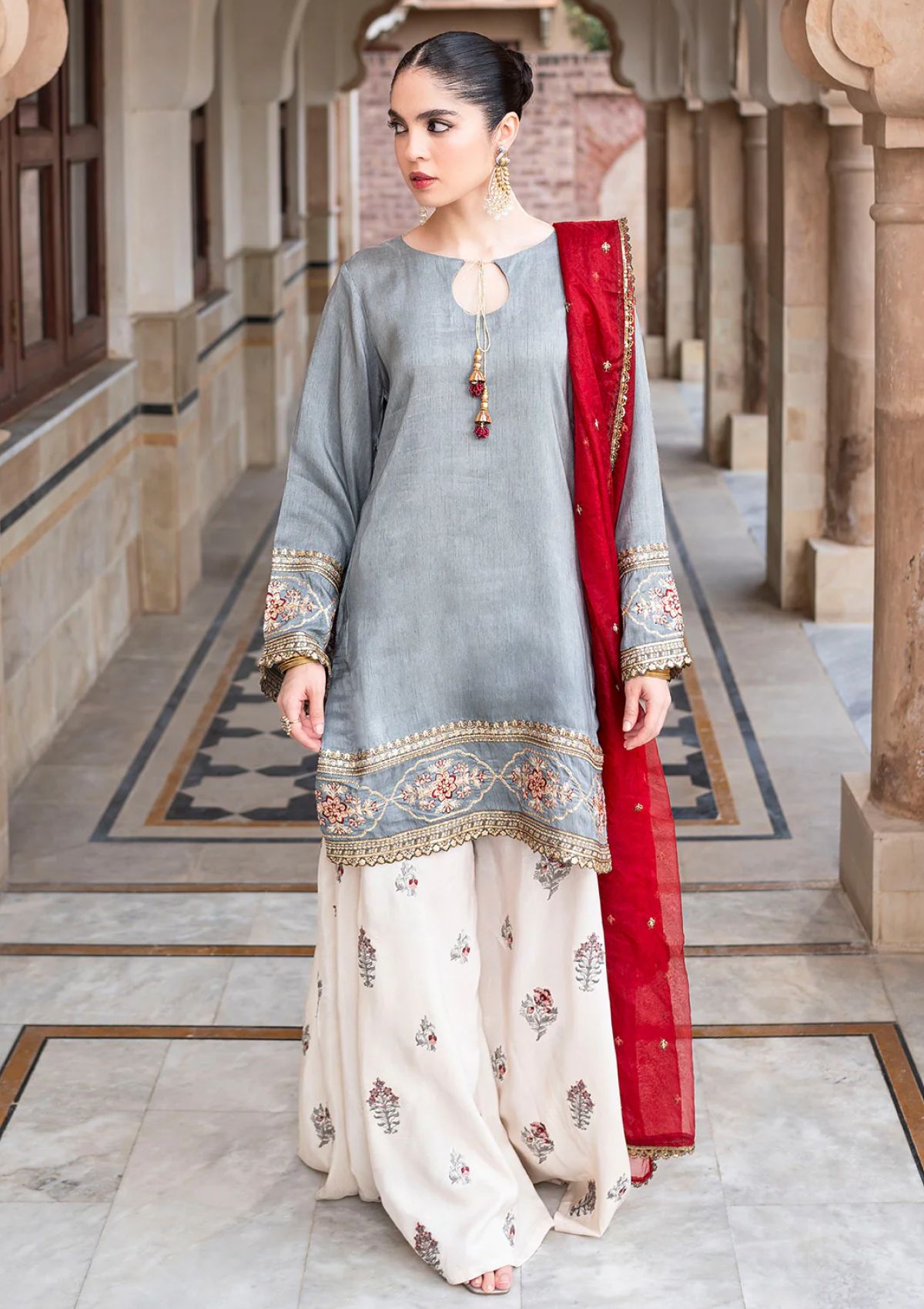A classic beauty with its embroidered front and back, combined with delicately dyed sleeves on Bamber Raw Silk. The sharara, crafted with fine embroidery, adds a traditional touch, while the organza dupatta offers the perfect finishing flourish for a refined look.