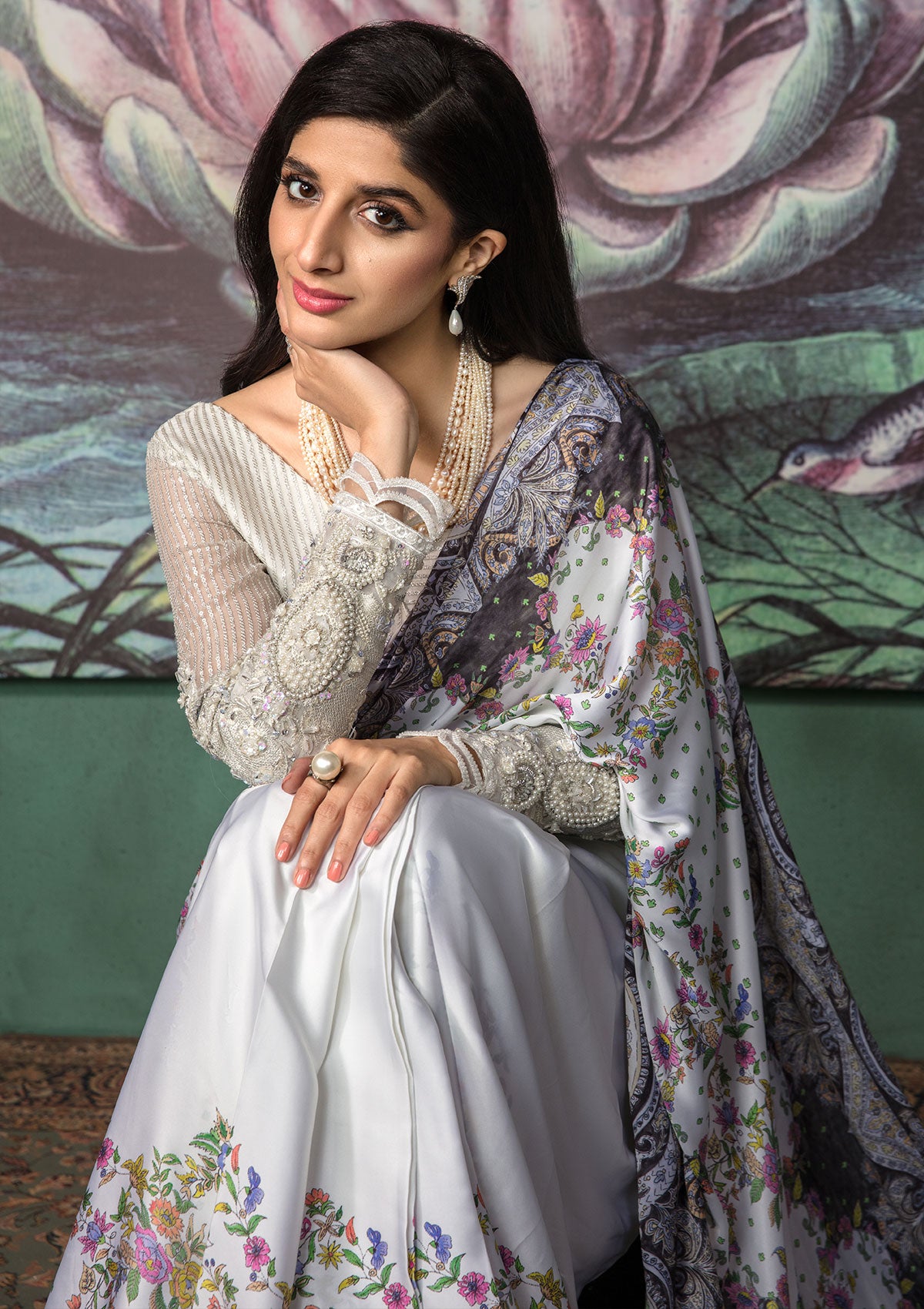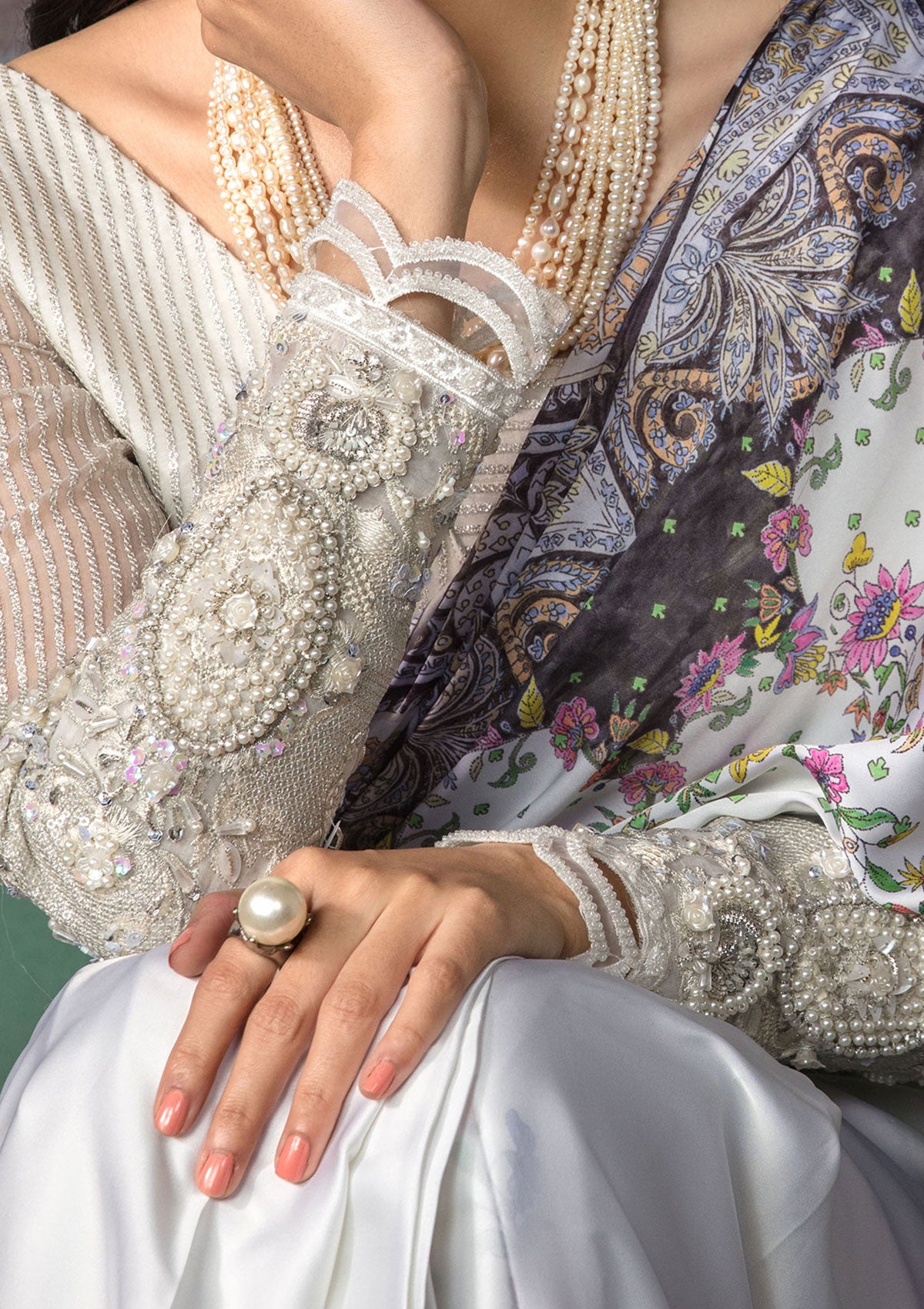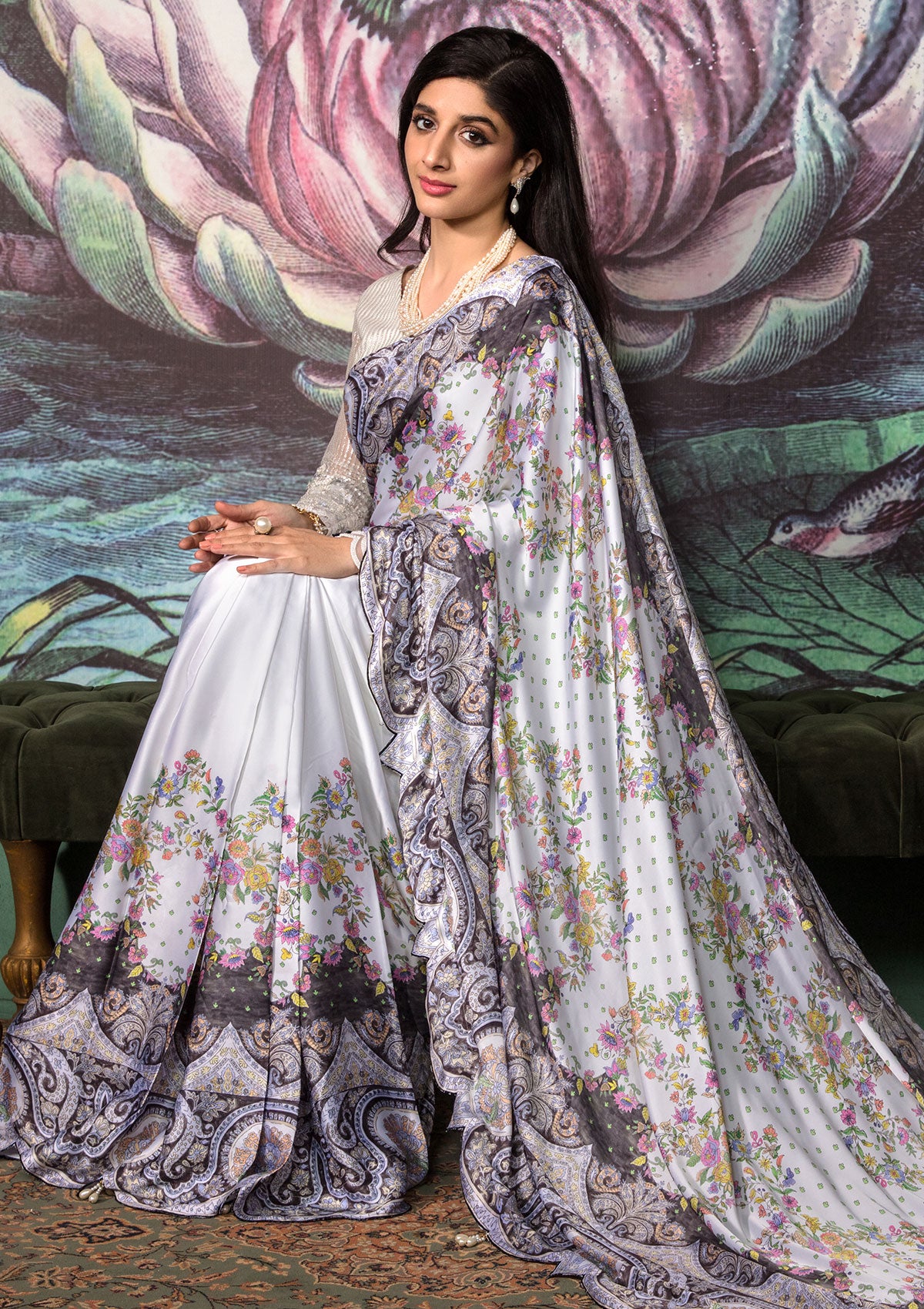 Luminous ornamental, paisley and floral print laid out in the shades of ivory and charcoal grey with tinges of moss and salmon pink to accentuate the overall composition. A printed charmeuse silk saree is effortlessly draped and paired with heavily embroidered blouse. The sleeves of the blouse is hand embroidered with matching sequins, crystals pearls and beads. The unique and versatile ensemble is perfect for the seasonal festive