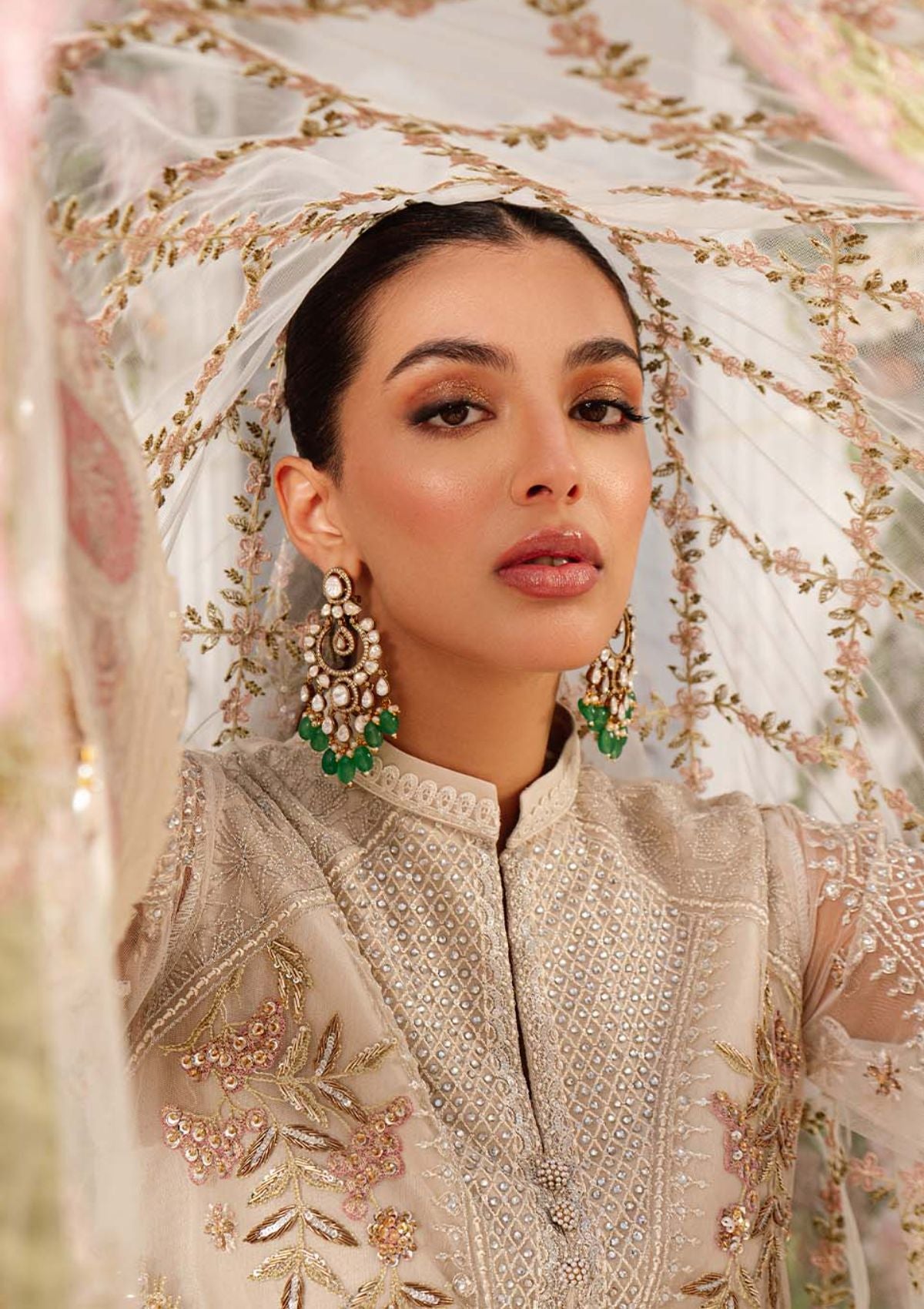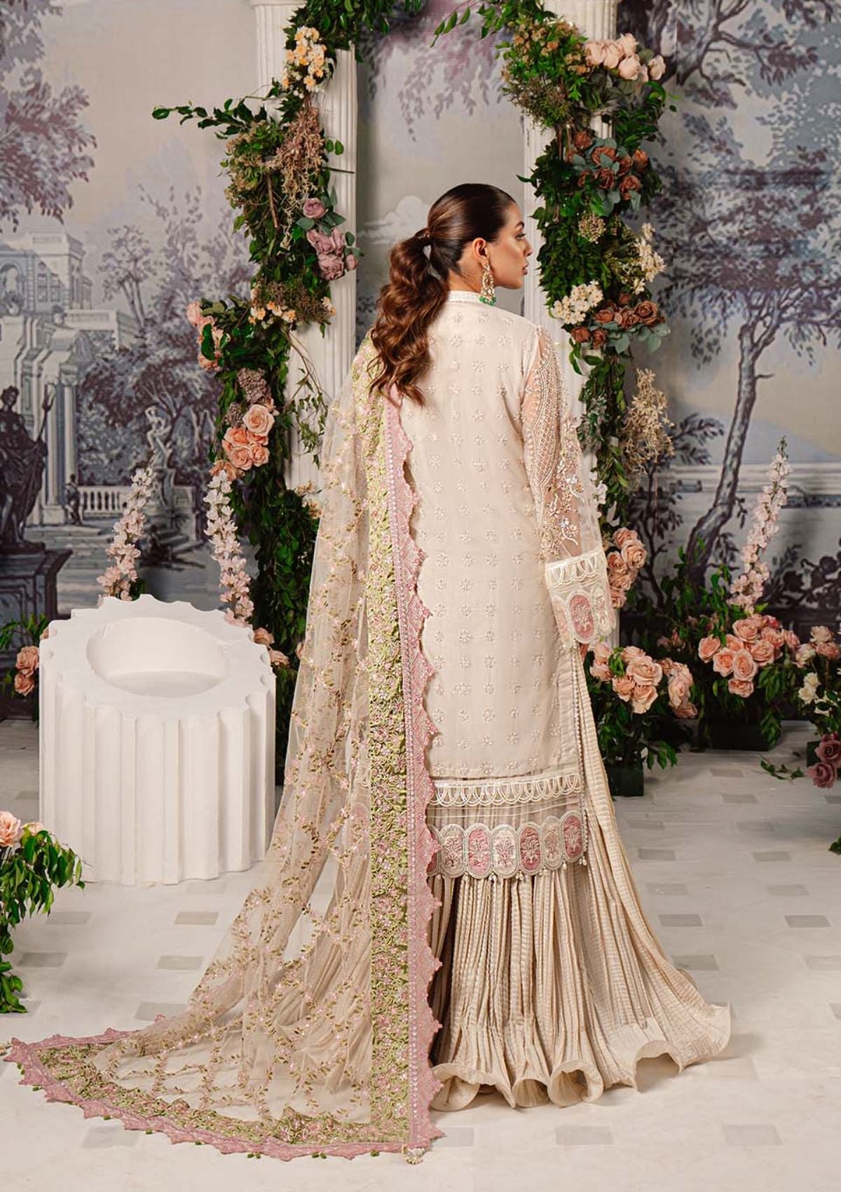 Show casing a front open jacket shirt in ivory hue. Crafted from a fine net base ivory tulle is enlivened with beautiful peach, blush and nude florals and iridescent liner details in ethereal ‘YARA’. Dazzling sequence crystals and pearls are delicately placed by hand onto the silver and sit thread worked blooms, creating a divine composition. A gorgeously detailed embroidered dupatta features delicate lush satin embroidered borders in blush and lime hues creating a heavily detailed formal ensemble is an ultimate keepsake.