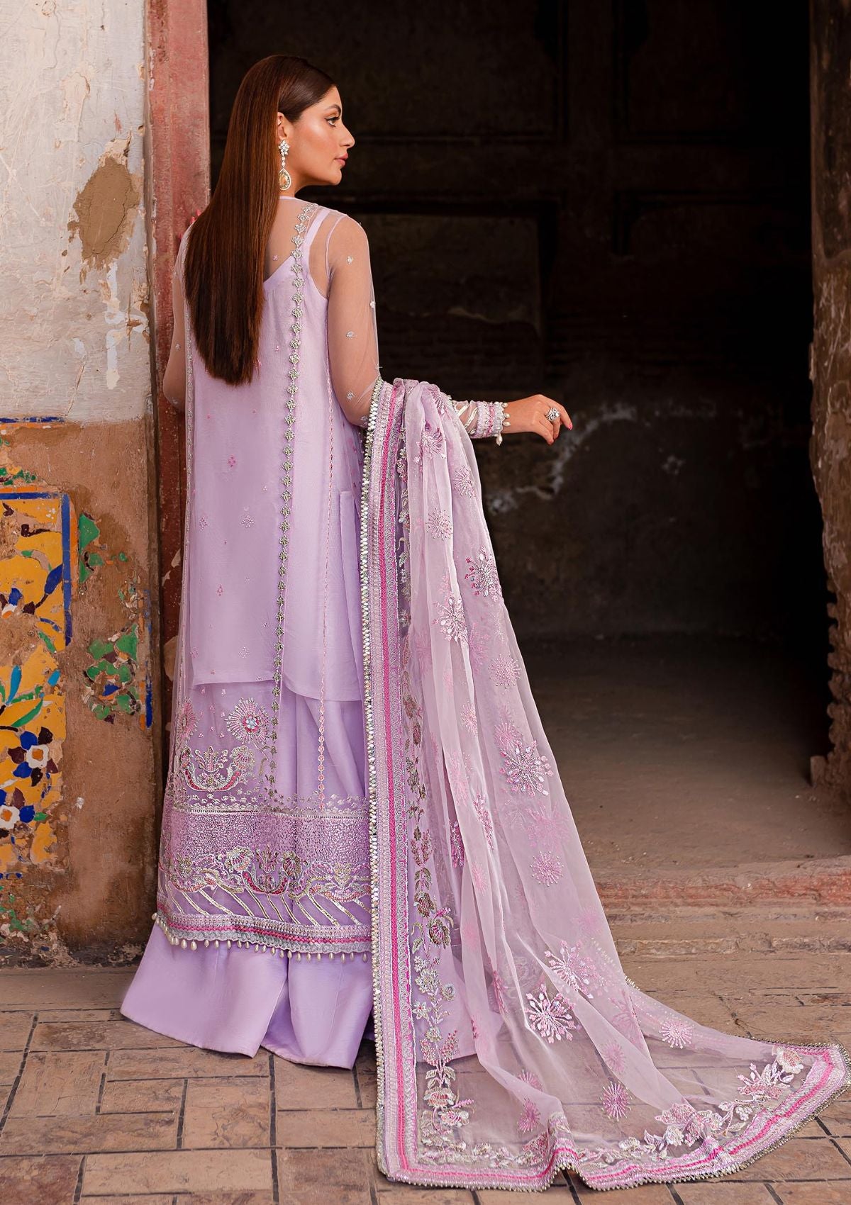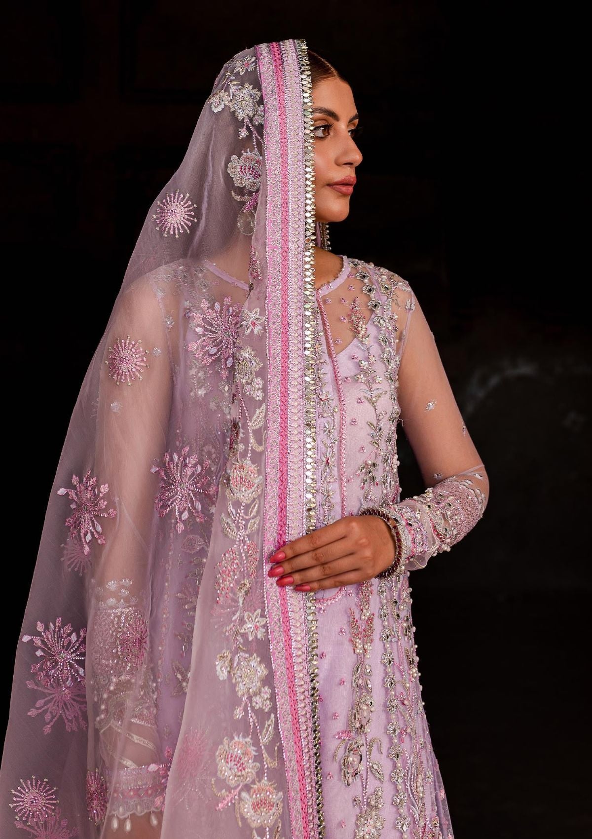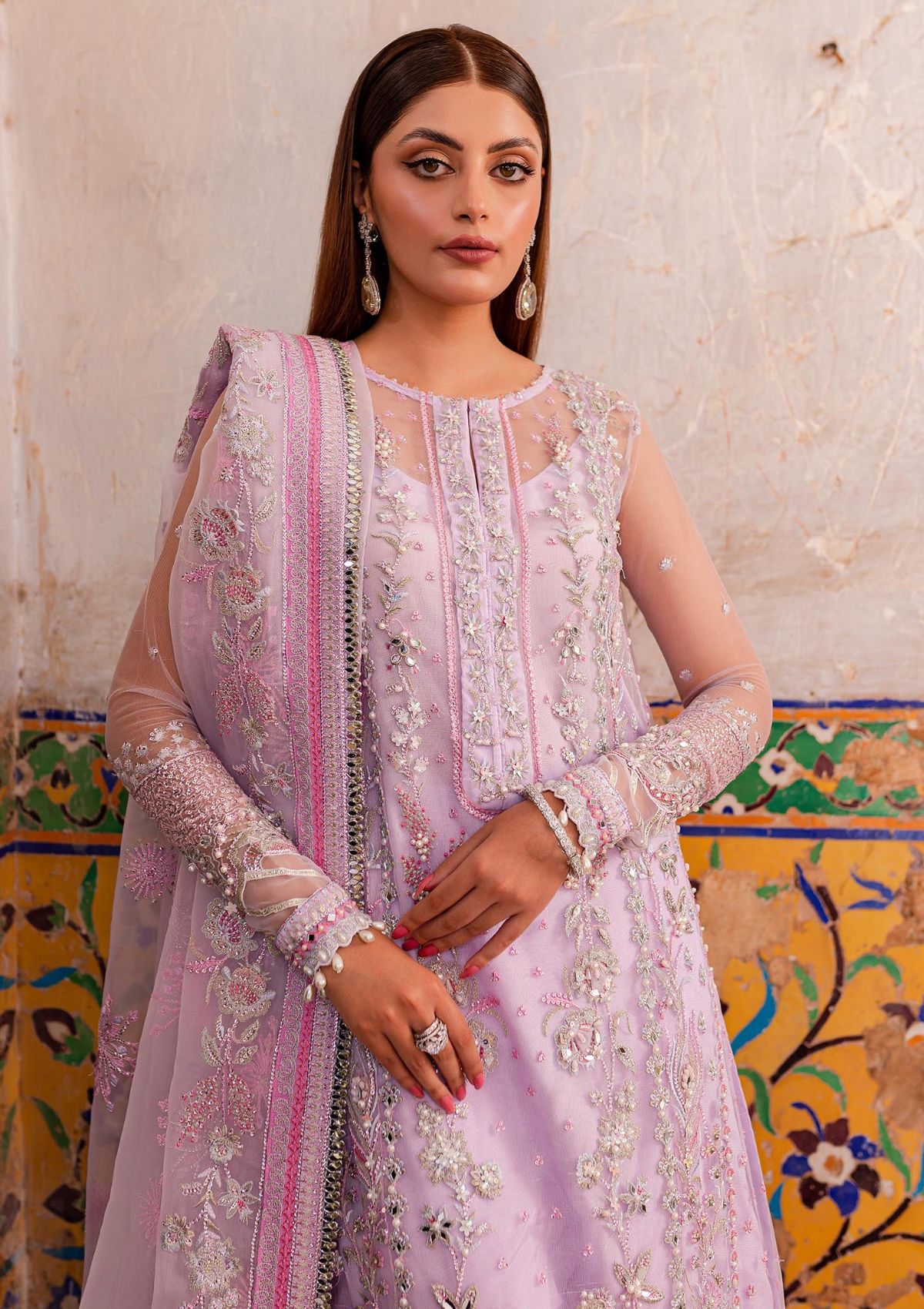 Crafted On A Lilac Canvas With Accents Of Pastel Tones, Azlin Features A Hand Embellished Long Jacket With Intricate Patterns Of Embroidery Adorned With Crytals And Creamy Pearls. It Comes With Heavily Embroidered Graceful Organza Dupatta And Same Toned Rawsilk Undershirt And Azaar, Giving Out A Divine Outlook.
