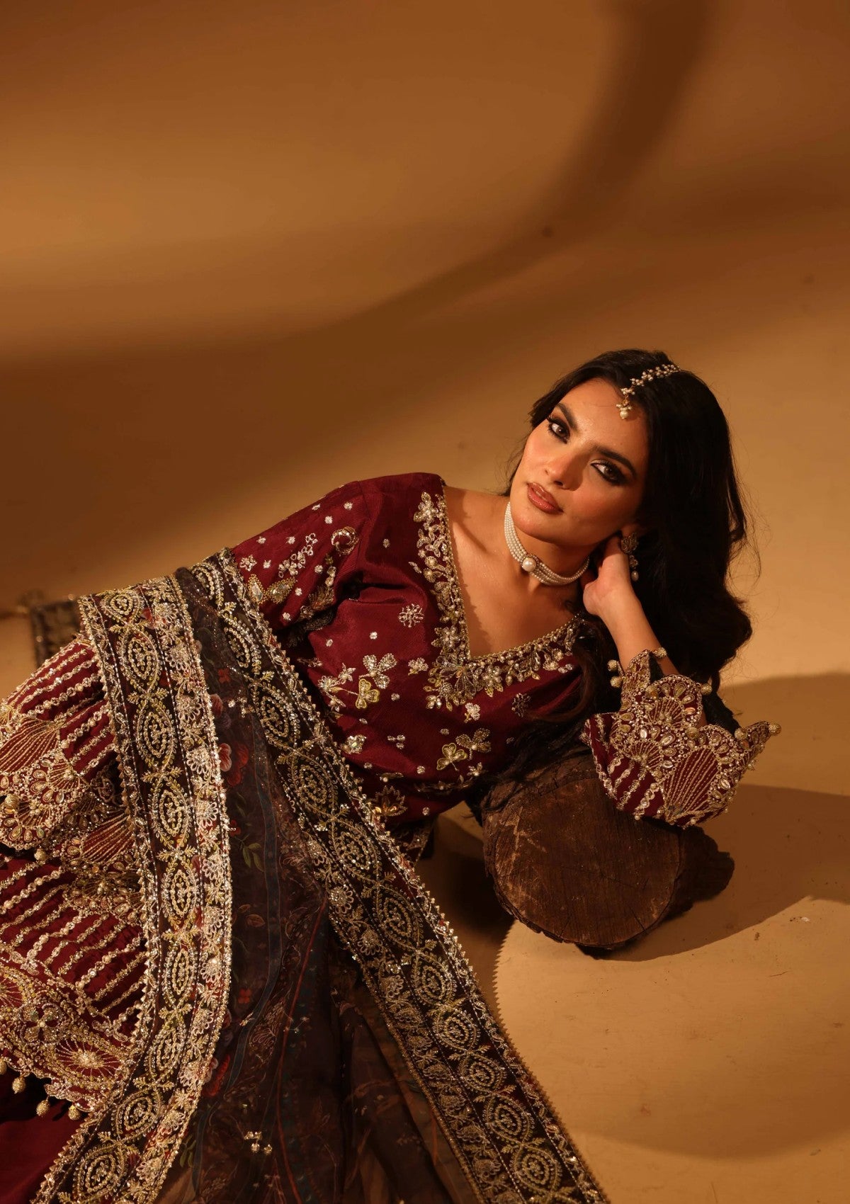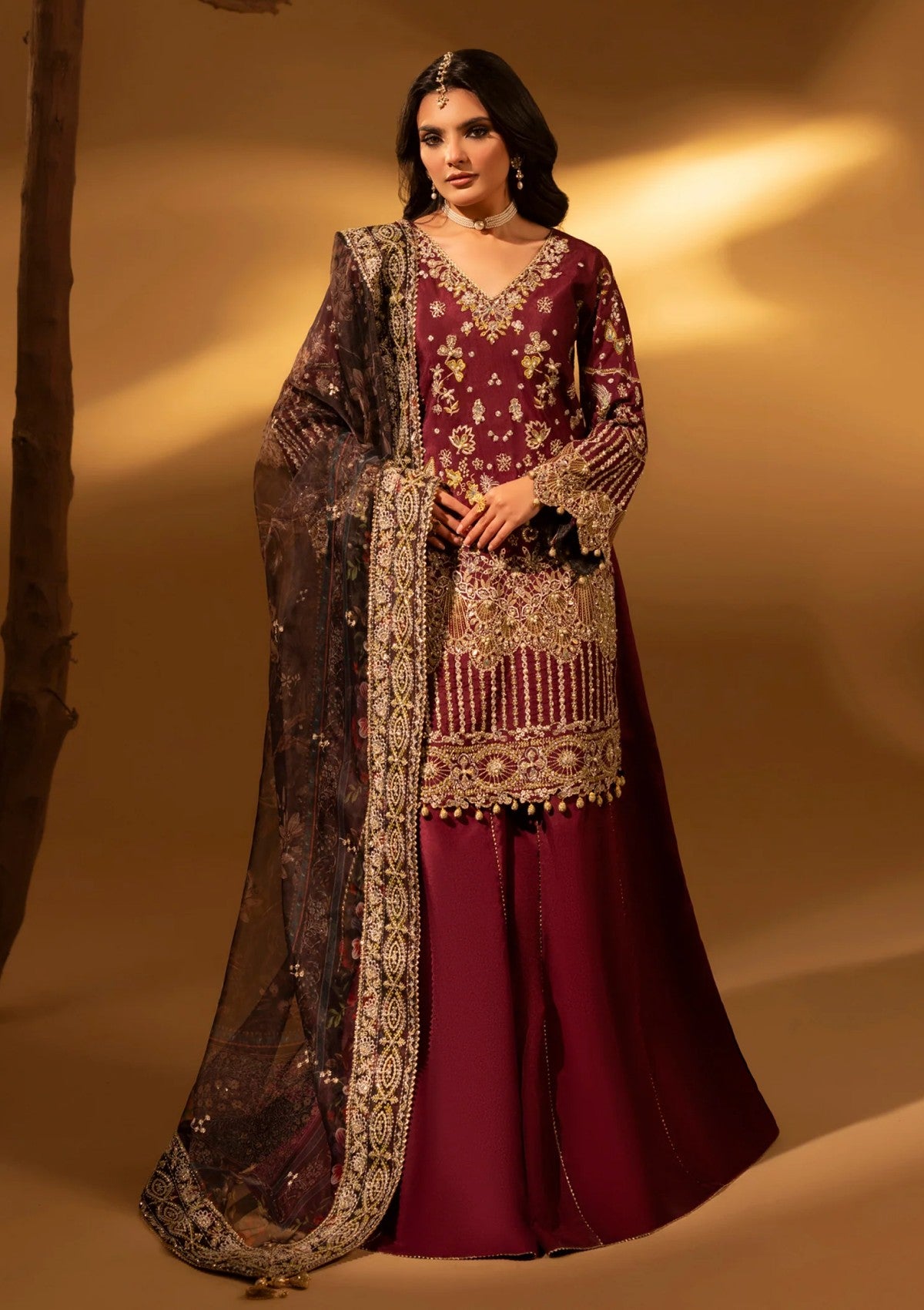 Sophisticated and luminous, Violet Bloom blends regal color with refined craftsmanship. Hand-embellished panels and sleeves on raw silk create a subtle shimmer, enhancing the richness of its maroon hue. The embroidered back and border complete the shirt with a polished, couture finish.A printed and embroidered organza dupatta, framed with an ornate foreside border, adds dimension and movement. Finished with a dyed trouser, Violet Bloom is a graceful choice for elevated festive and formal occasions.