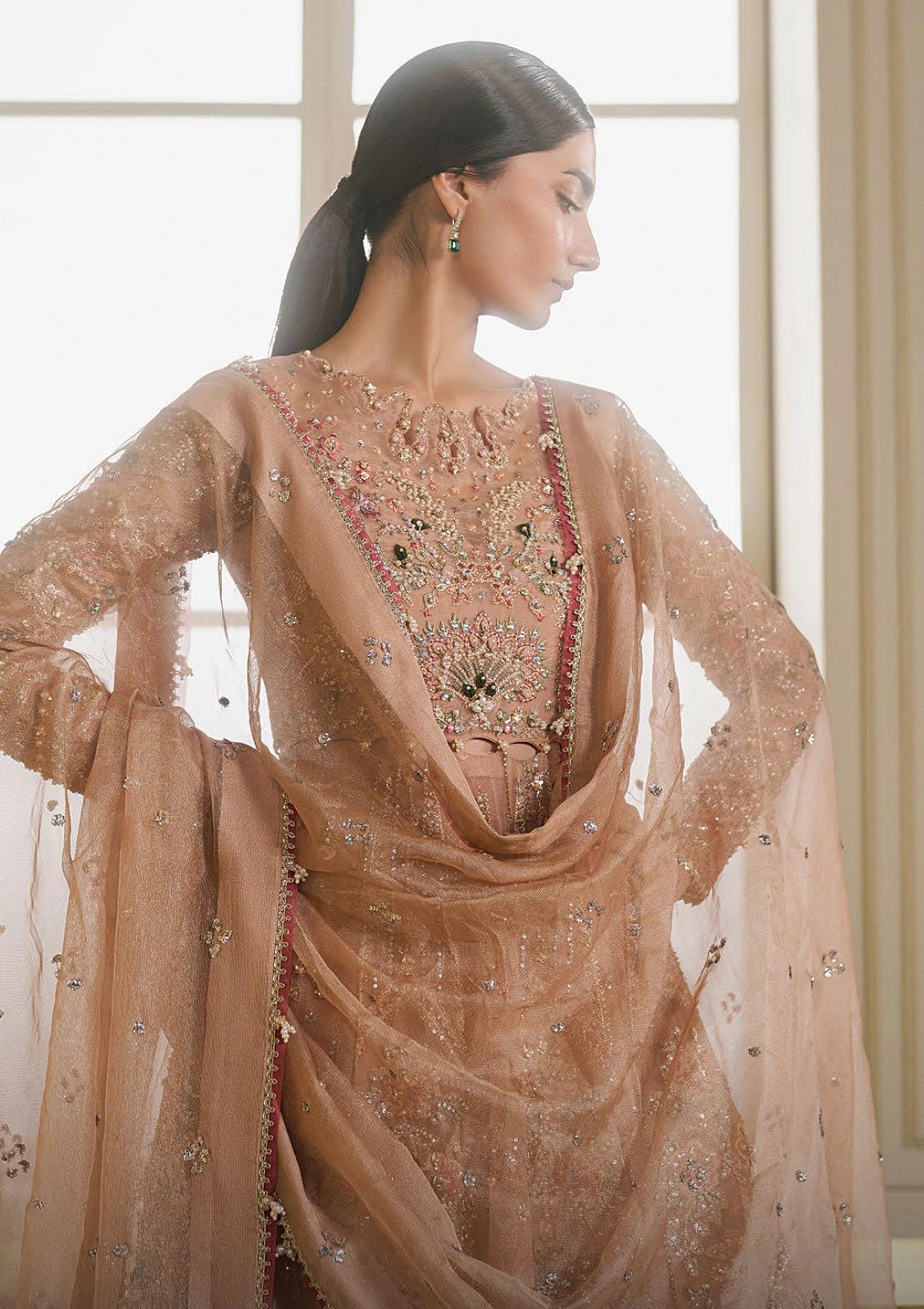 A whisper of dawn’s first blush, this ensemble feels like morning unfolding on the skin. A soft rose canvas glimmers with threads of champagne and moonlit silver, each motif blooming like petals touched by gentle daylight. The subtle play of pastel mint beneath adds an undercurrent of calm — like cool air drifting through a quiet garden at sunrise. The silhouette floats with airy elegance, layered in textures that feel both serene and opulent. This is an ode to renewal — tender, luminous, and endlessly graceful, like the moment the world exhales and begins again.