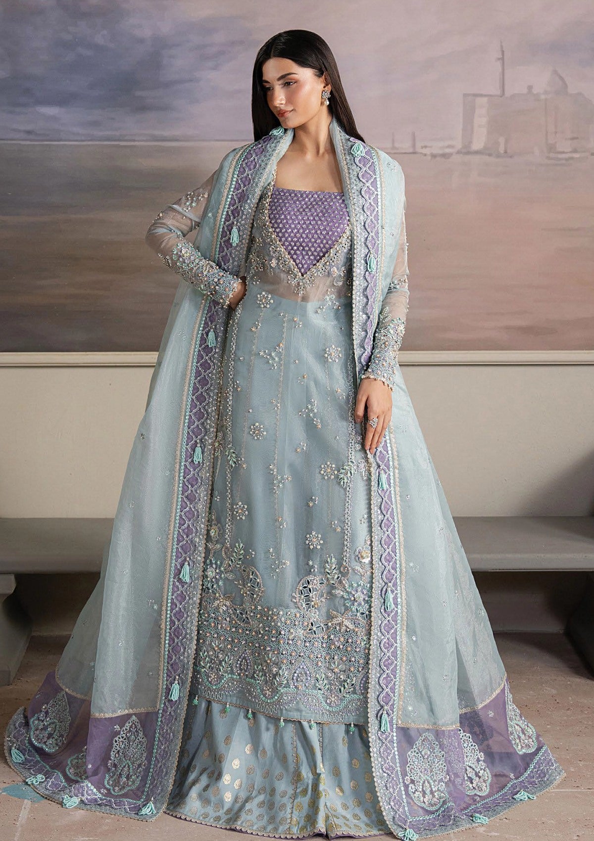 A whisper of twilight elegance — this ensemble drapes the aura of calm seas and fading skies. The periwinkle canvas shimmers with intricate silver and lilac embroidery, each thread glinting like the last rays of dusk on still water. A soft, sheer dupatta flows with celestial ease, kissed by drops of mint and violet, mirroring clouds adrift in quiet motion. Beneath its serene tones lies an unspoken strength — gentle, composed, and endlessly graceful. It’s an ode to dusk itself — serene, reflective, and eternally luminous.