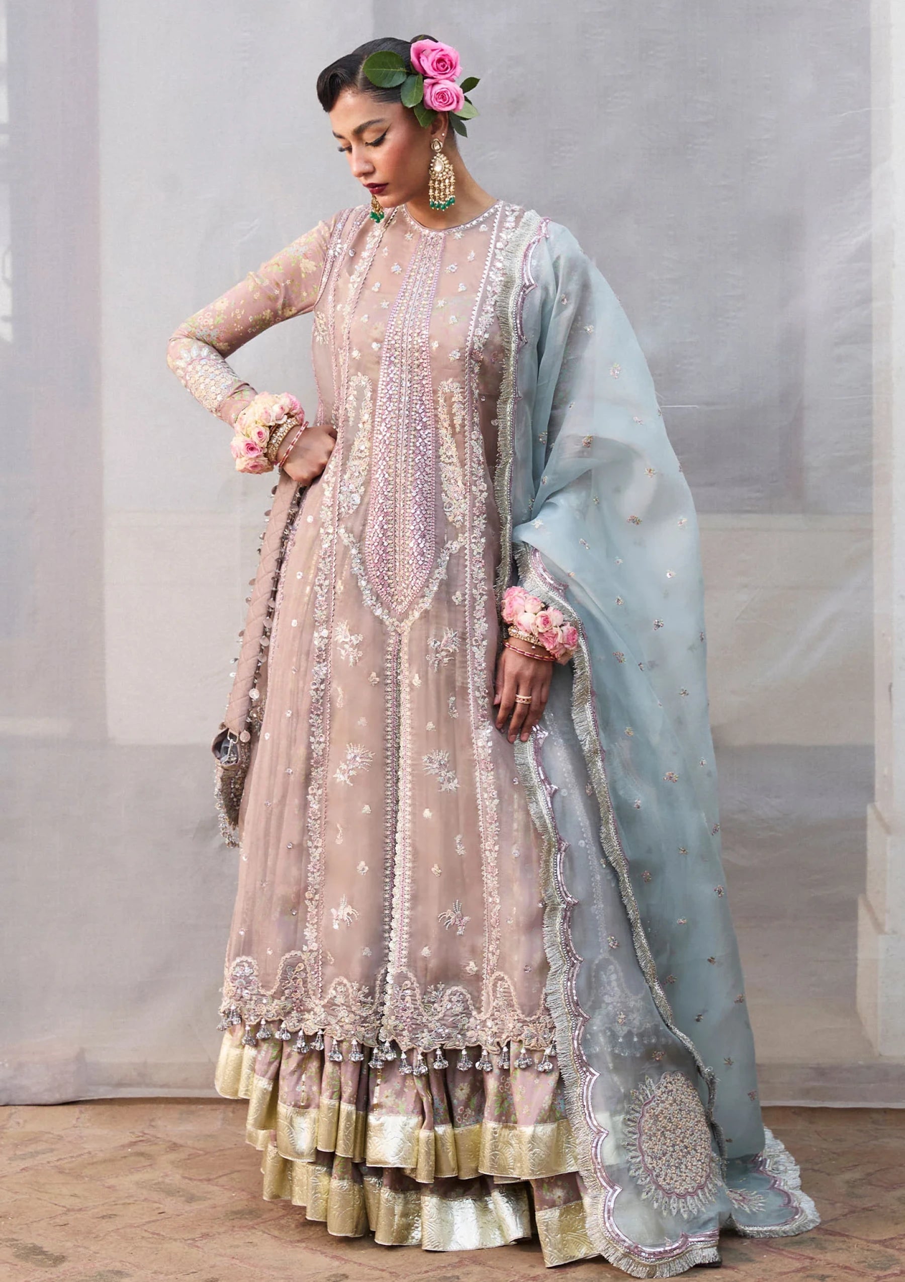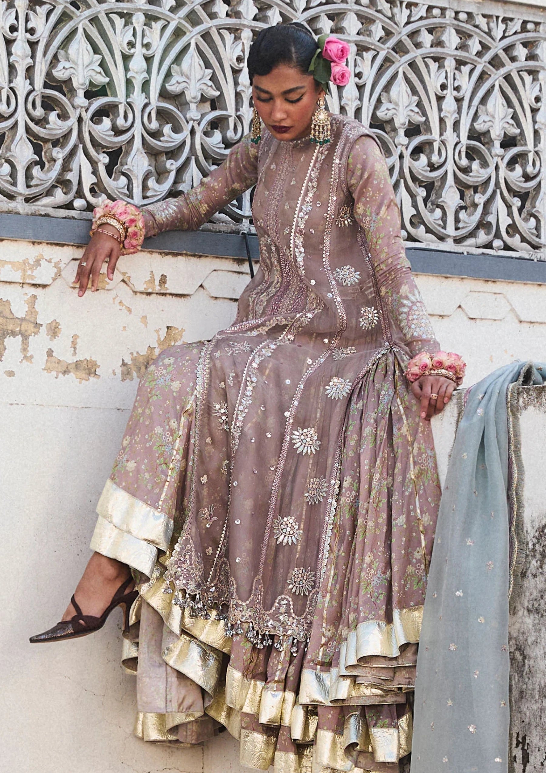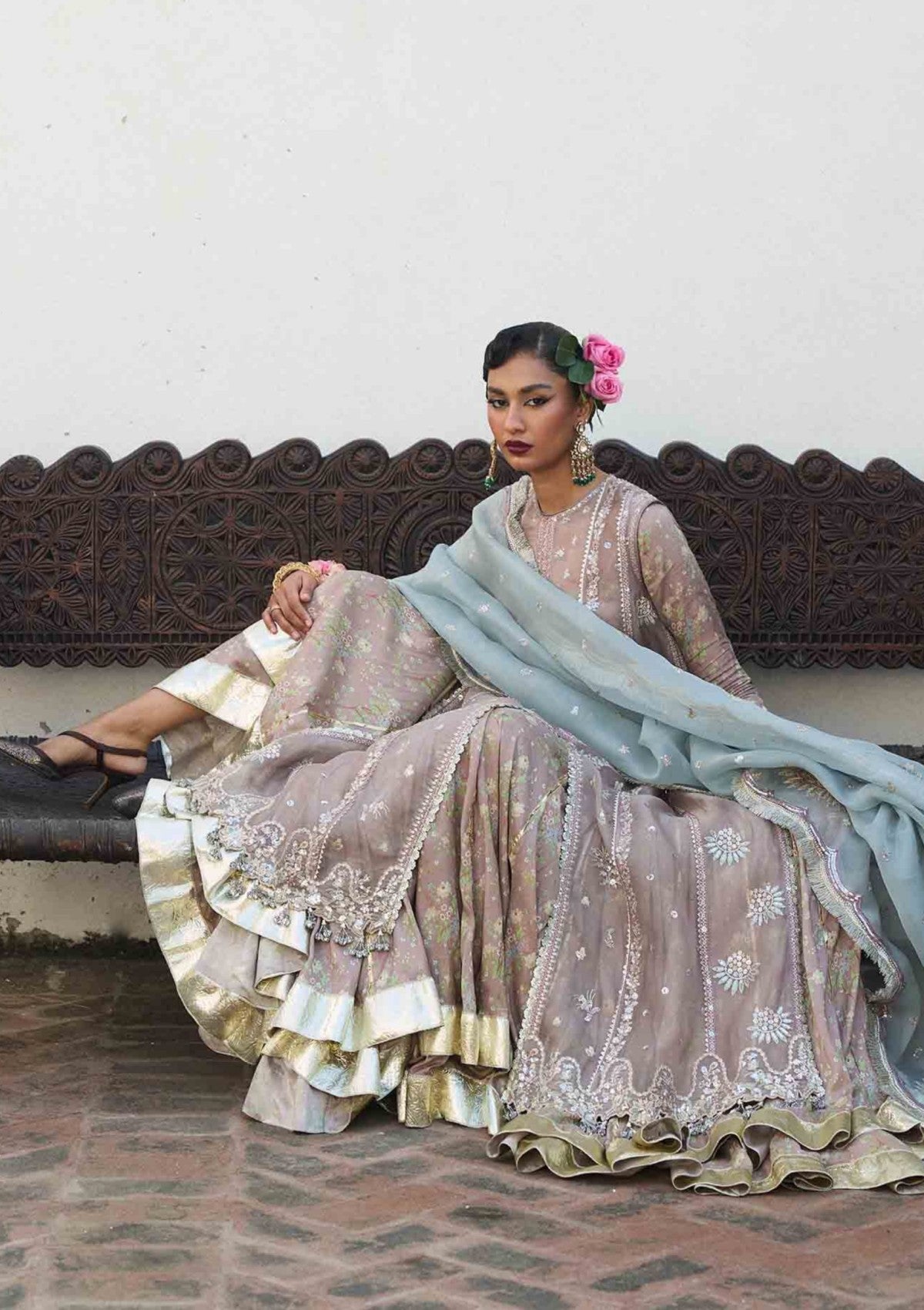 It is an embroidered jacket paired with printed lehnga that adds volume and enhances the design elements. The inner is attached with sleeves which is printed Thai silk along with an embroidered motif on the sleeves border. Organza embroidered dupatta with four side borders adds a glamorous touch. The intricate embroidery on the dupatta makes it a real showstopper. This outfit is perfect for making a fashionable impression.