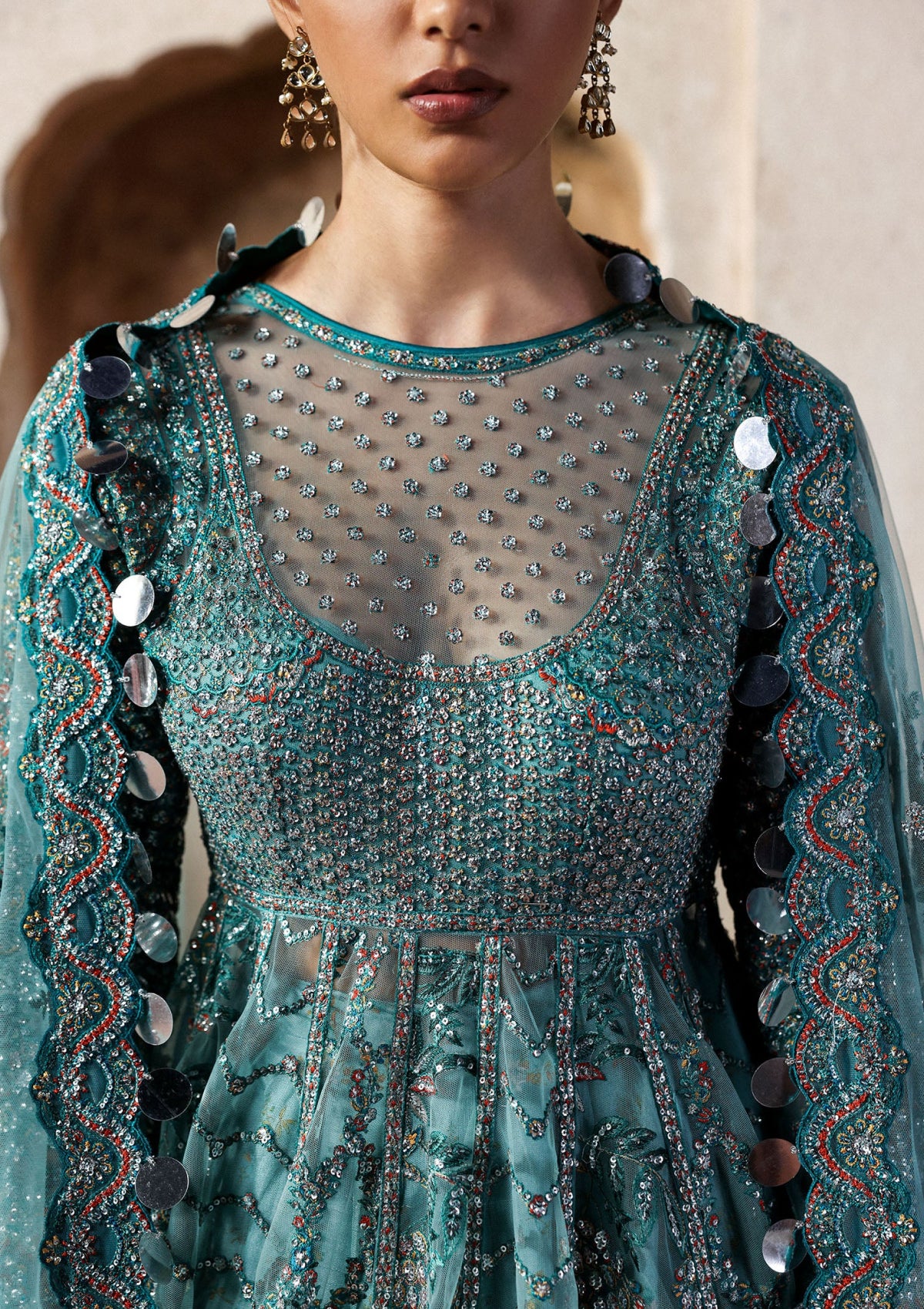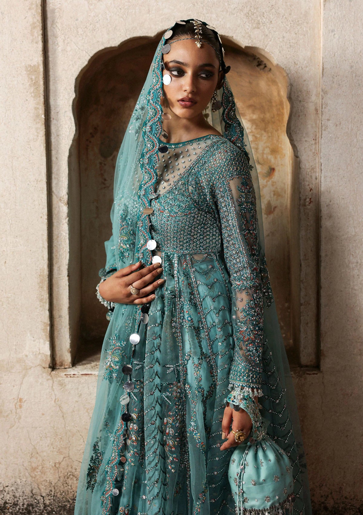 Ice blue net pishwas is delicately adorned with three different embroidered sequin panels and sleeves, creating a dreamy and ethereal look. It is paired with a digitally printed Korean raw silk lehnga that enhances the outfit with a soft and graceful flow. The dupatta crafted in chiffon with embroidered borders on all four sides adds the perfect finishing touch. This attire is a version of elegance and charm