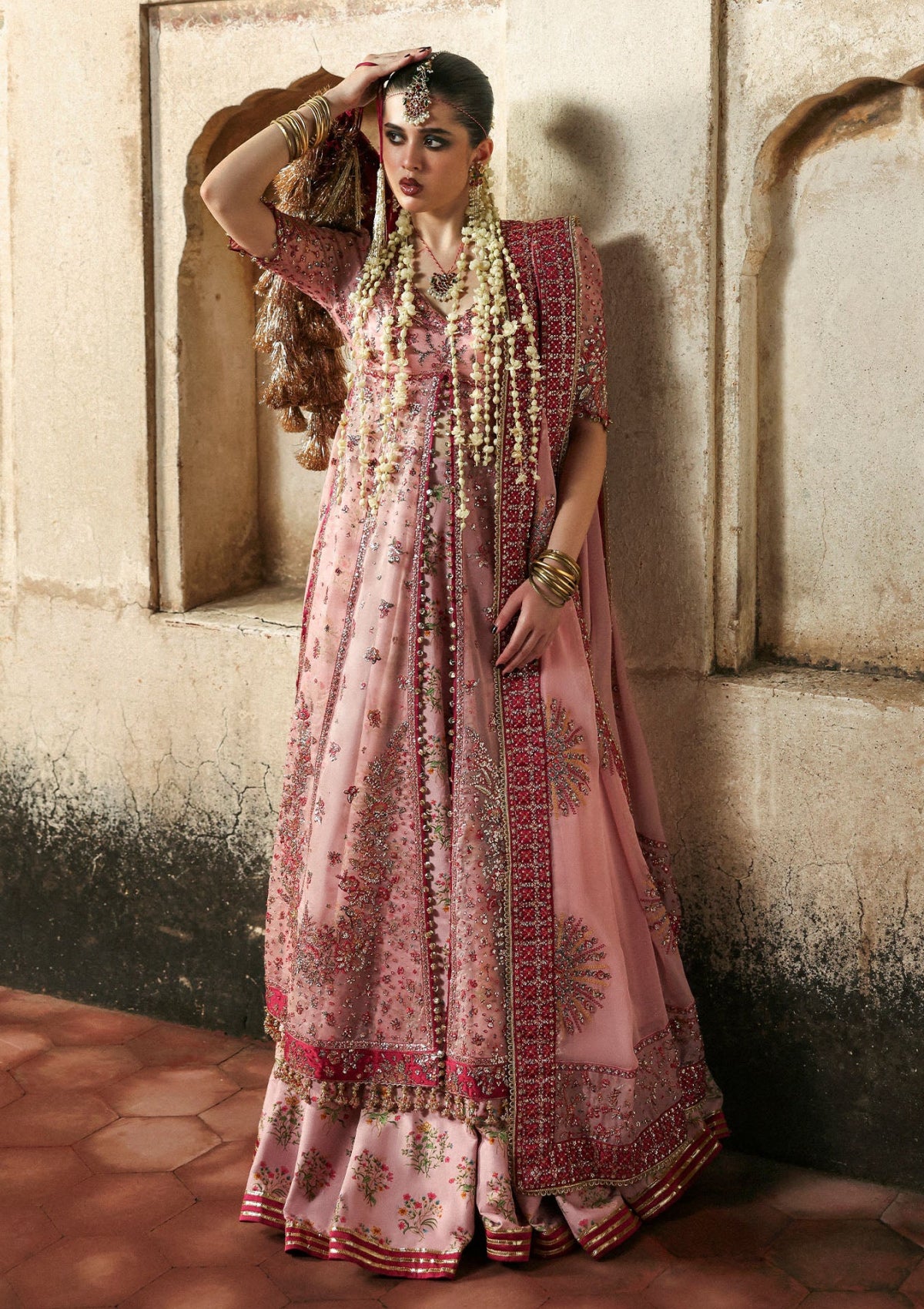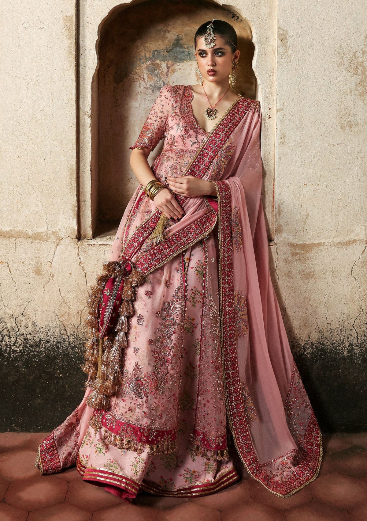 This pink organza shirt with front open pishwas is designed with embroidered panels on front and back, highlighted with embroidered sleeves and daman border that elevate its charm. Paired with a digitally printed Korean raw silk lehnga, this outfit adds a graceful appeal to finish the look. The chiffon dupatta is detailed with four side fuchsia pink embroidered borders. This attire is a harmonious blend of style and modern appeal