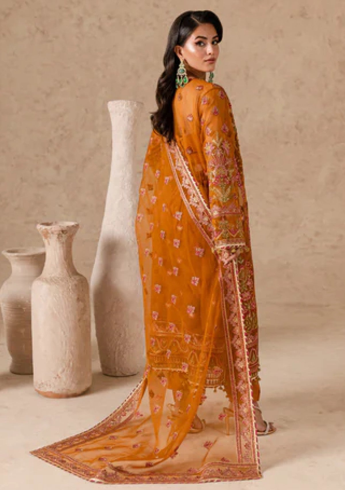 This luxury dress is a dazzling fusion of traditional artistry and opulence. Adorned with golden Dabka and Naqshi work, it radiates a regal charm, while Bethki and Kashti work add intricate detailing. The dress is further embellished with shimmering Phool Sitara, elegant Moti, and luminous Pearls. Nag and Plate Sitara complete the design, making this dress a stunning choice for the most sophisticated occasions.