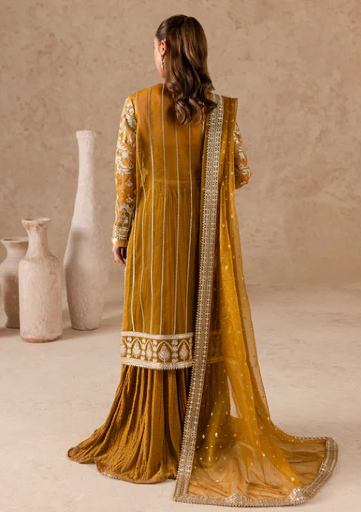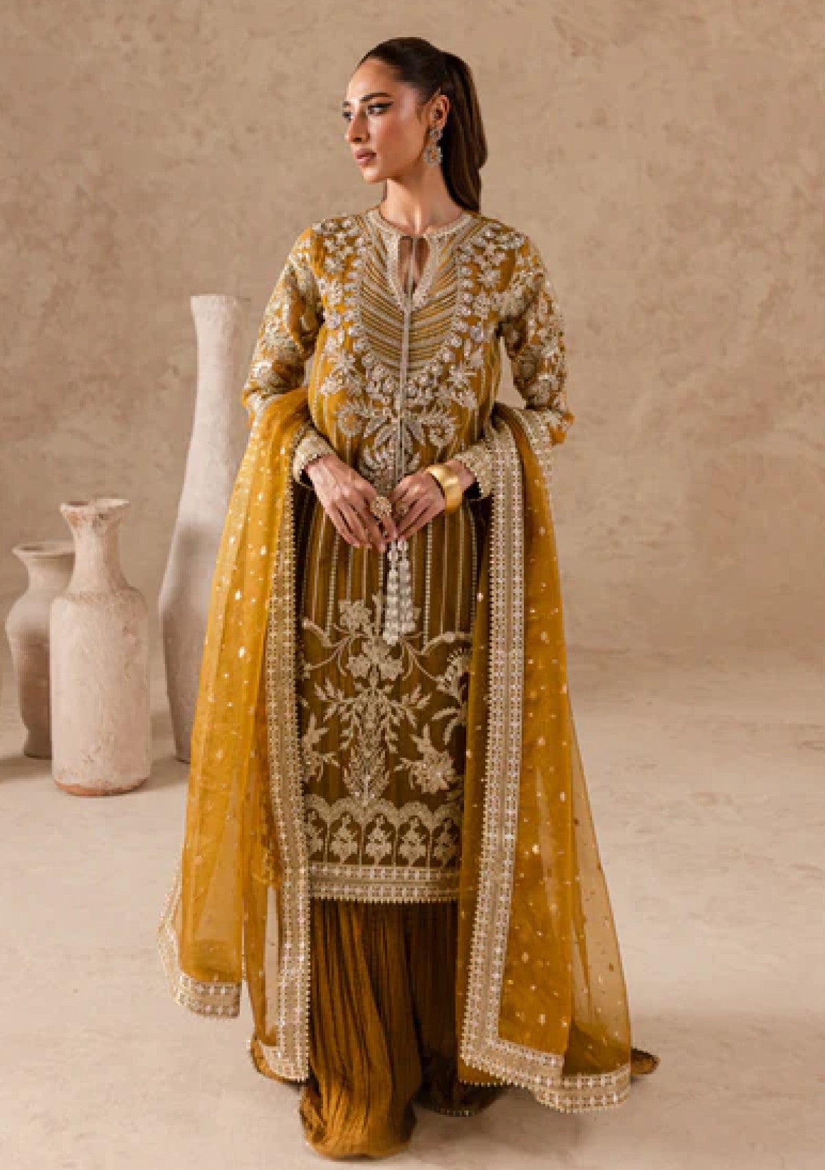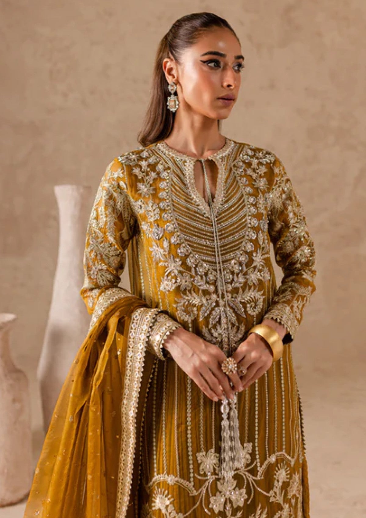 This luxurious dress is a breathtaking blend of tradition and elegance, featuring intricate Dabka and Naqshi work that highlights its rich craftsmanship. The Kashti and Bethki work add layers of refined detail, while the luminous Pearls and delicate Drops bring a touch of sophistication. Sparkling Glass Moti, Sitara, and Japanese Cut Dana create a captivating shimmer, beautifully complemented by the Surahi and Kulfi embellished work. This dress is a perfect choice for any grand occasion, embodying timeless beauty and luxury.