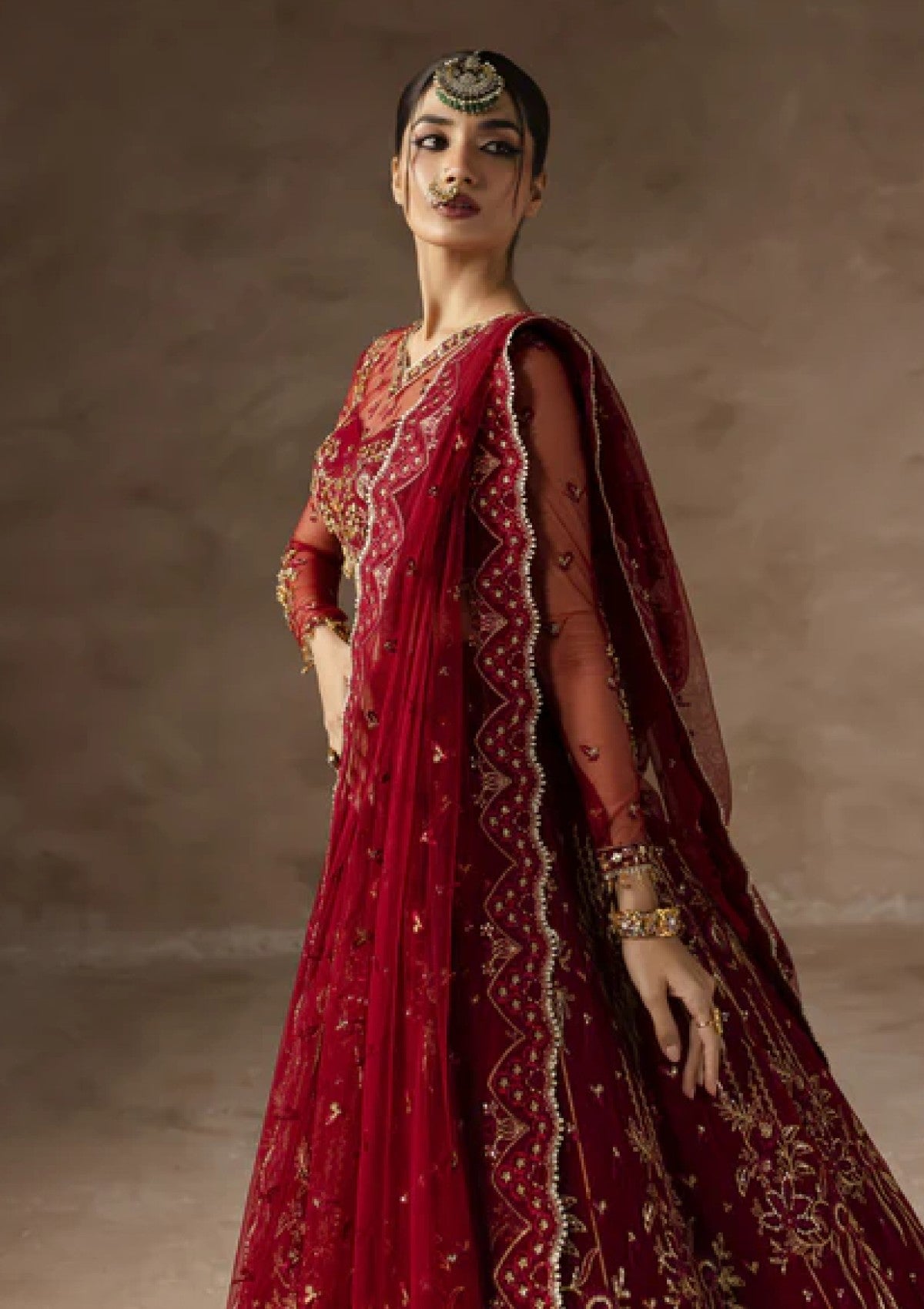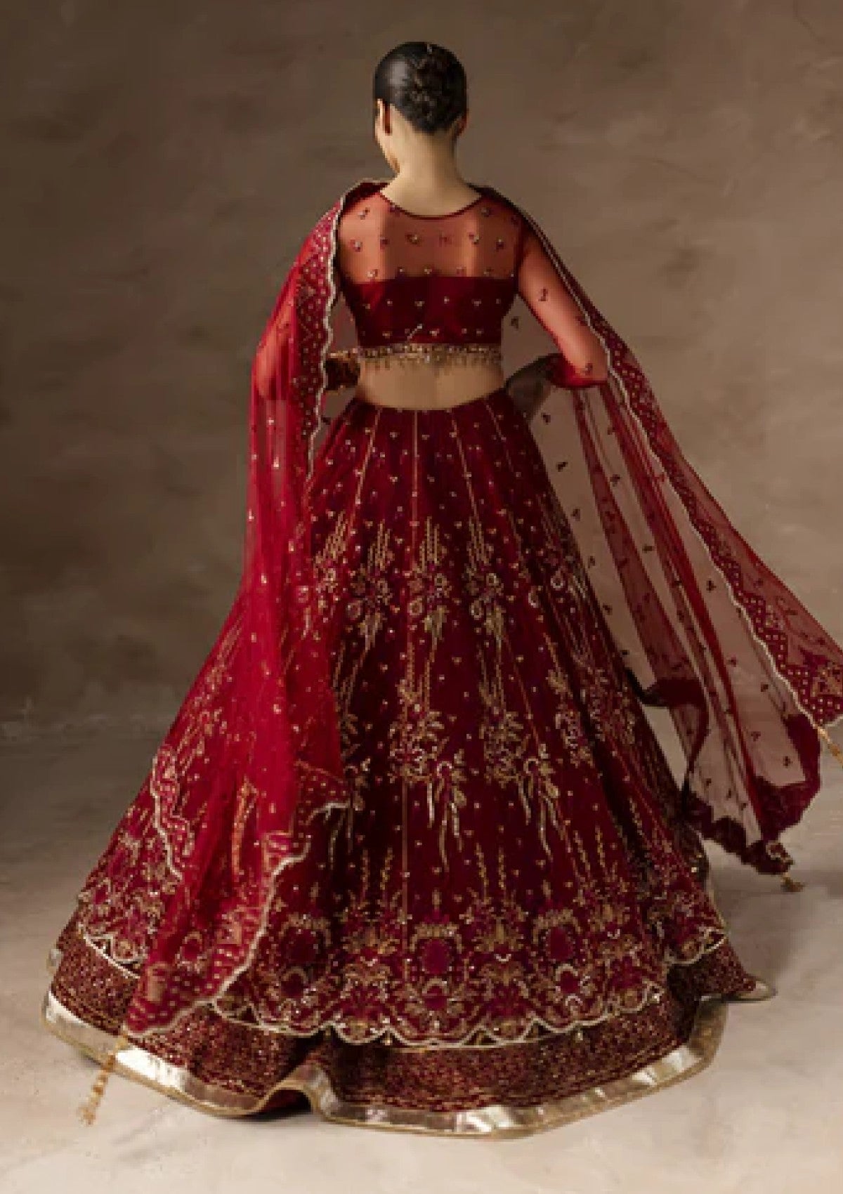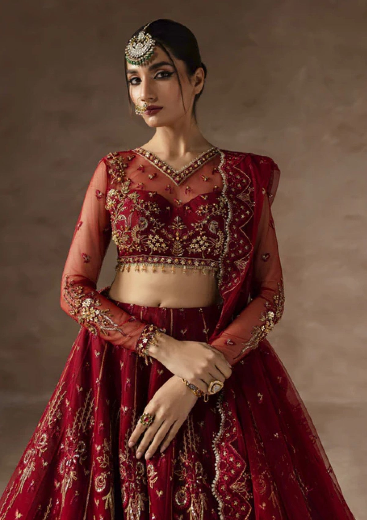 Drape yourself in eternal grace with this hand-embroidered red luxury lehenga. Designed for grand celebrations, it features intricate craftsmanship with Kulfi Drops, Bethki, Japanese Cutt Dana, Telenor Sitara, Berfi Ghota, Kashti Sitara, Cup Sitara, Kaanch Bantaa, Pearls, Crystals, Moti, and Pipe Work.