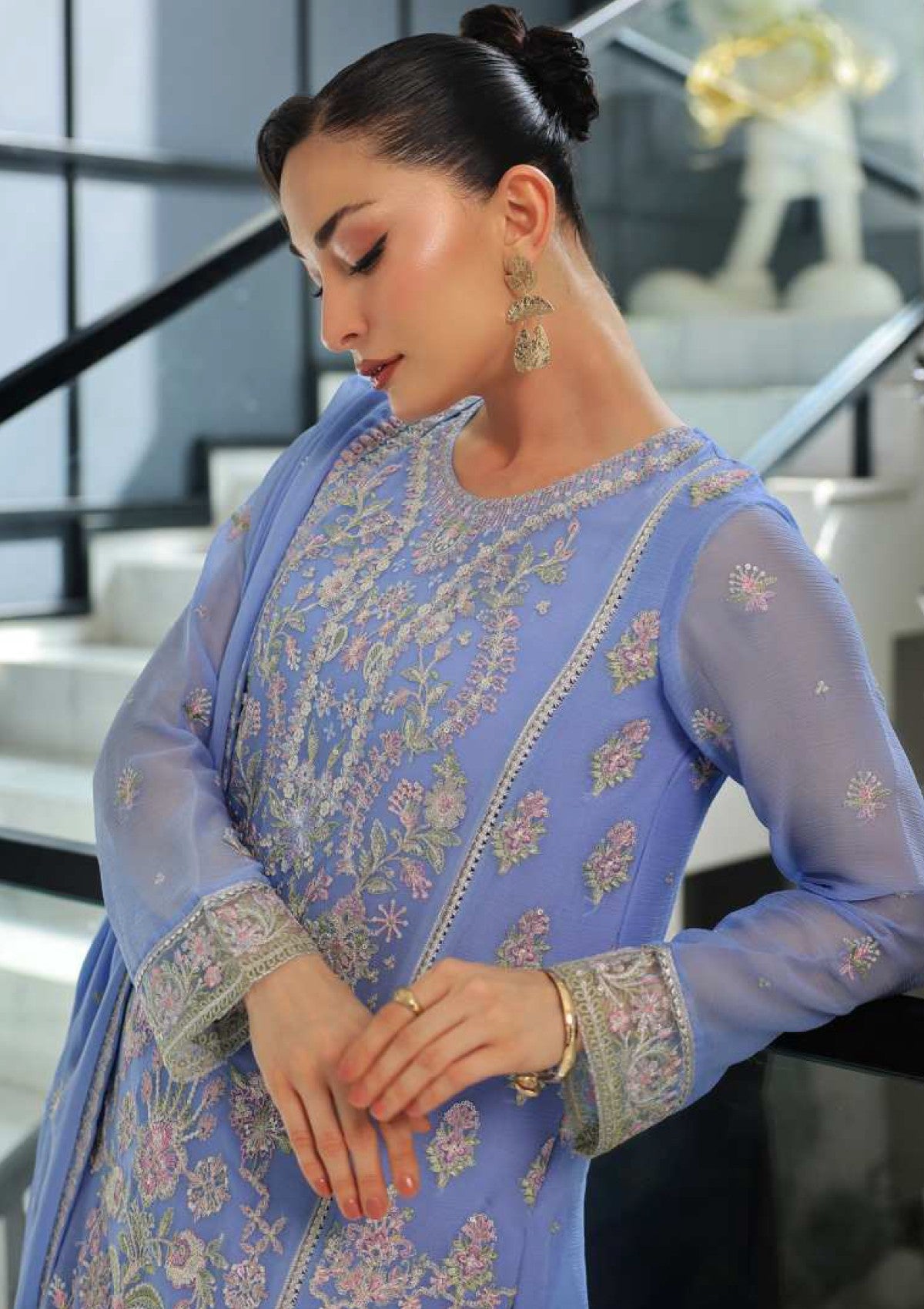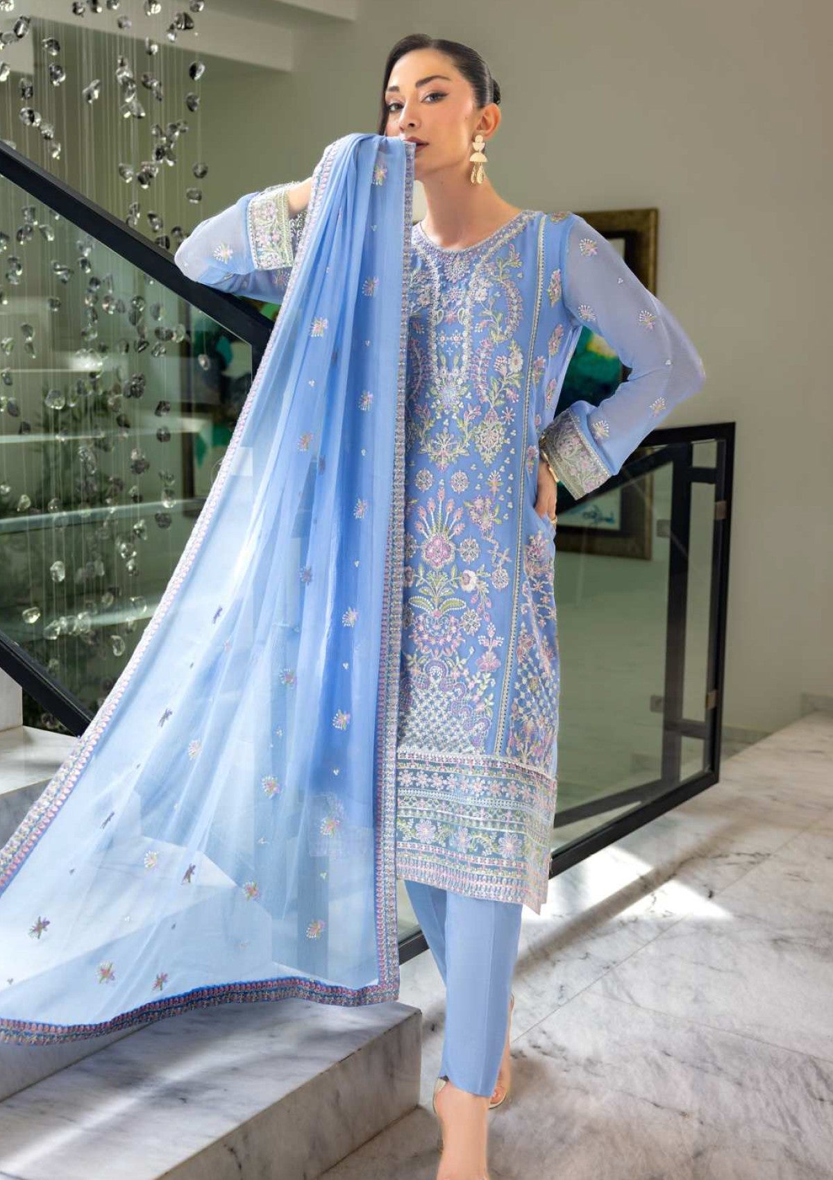 A powder blue chiffon ensemble featuring detailed embroidery on the center and side panels, paired with a matching embroidered dupatta and plain raw silk trouser. Organza borders add a refined finishing touch.