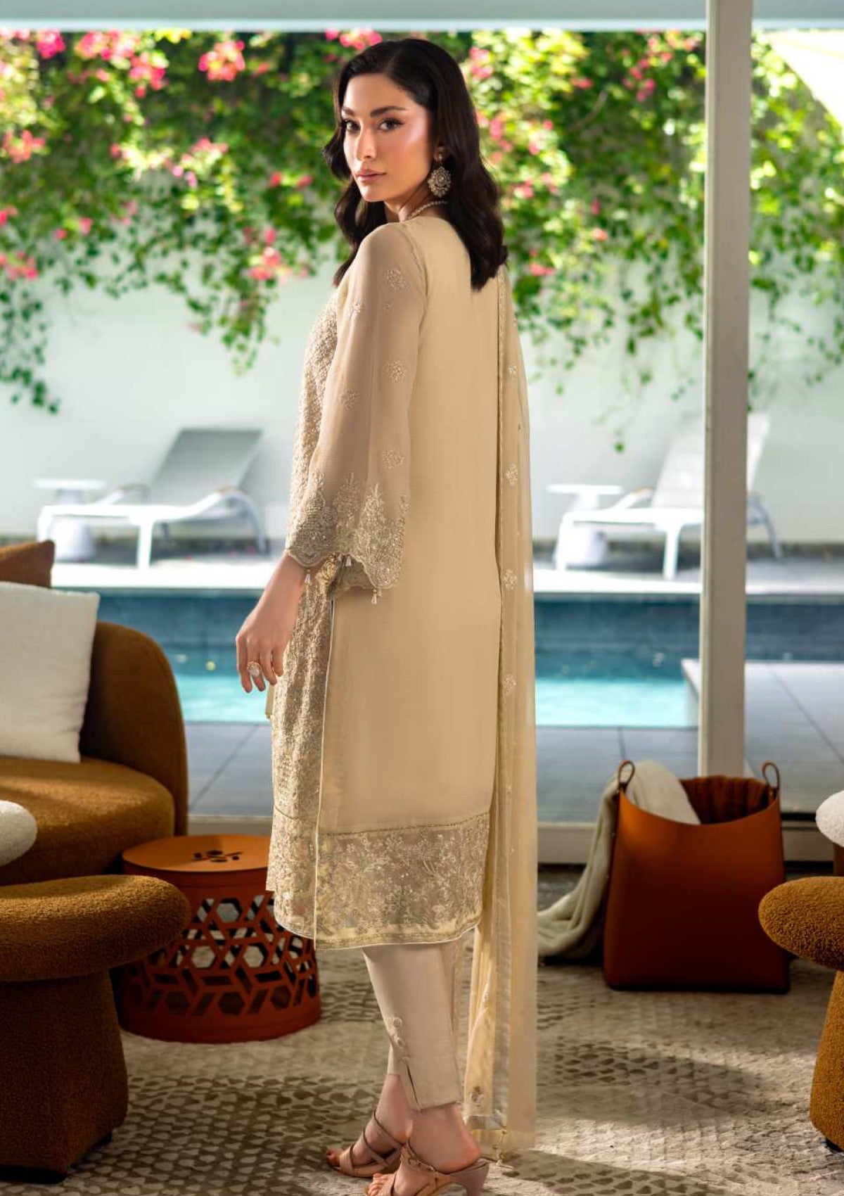 A beige chiffon ensemble with subtle embroidery and refined detailing, paired with a dyed raw silk trouser.