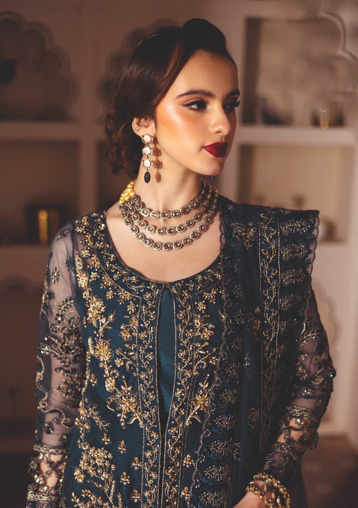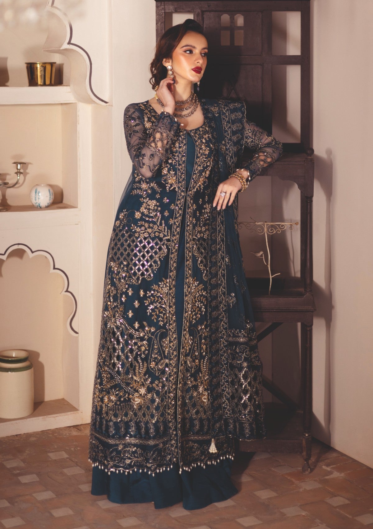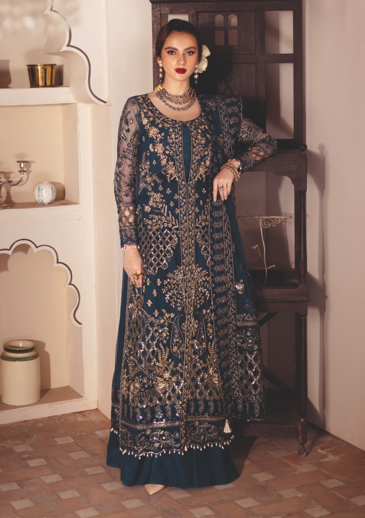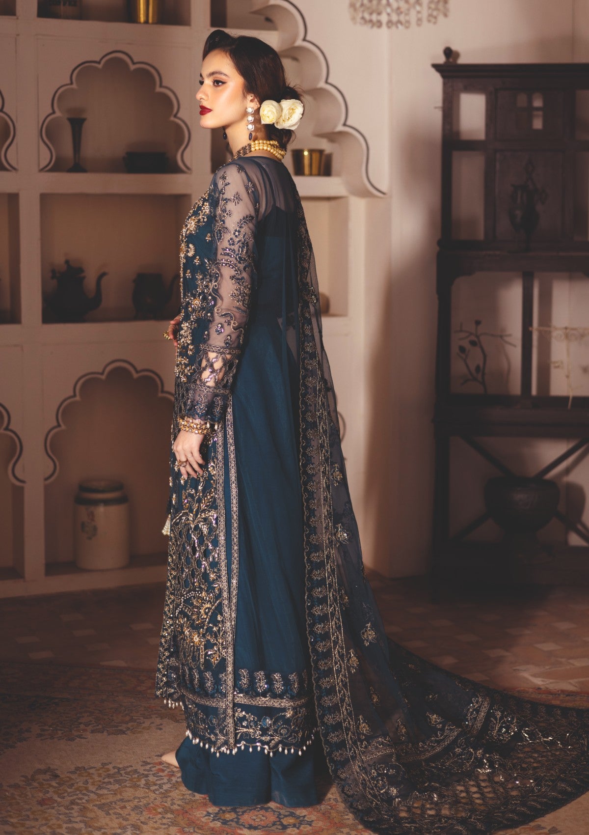 A mesmerizing net outfit featuring an embroidered front with left and right panels adorned with intricate adda work and hand embellishments. The front also includes patched embroidery with delicate cutwork detailing. The back and sleeves are embroidered, and the inner lining is soft cotton silk for comfort. The trouser is crafted from luxurious raw silk, while the embroidered organza dupatta with a 4-side border adds the perfect finishing touch.