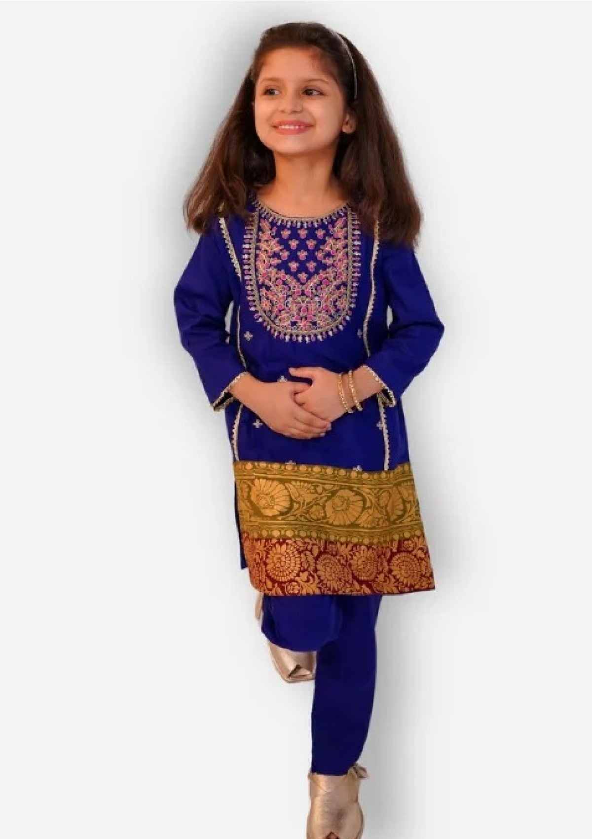 A majestic royal blue outfit richly embroidered with tilla and fuchsia-green thread, radiating regal charm. The screen-printed contrast border adds a striking finish, making it a perfect choice for festive occasions and grand celebrations.