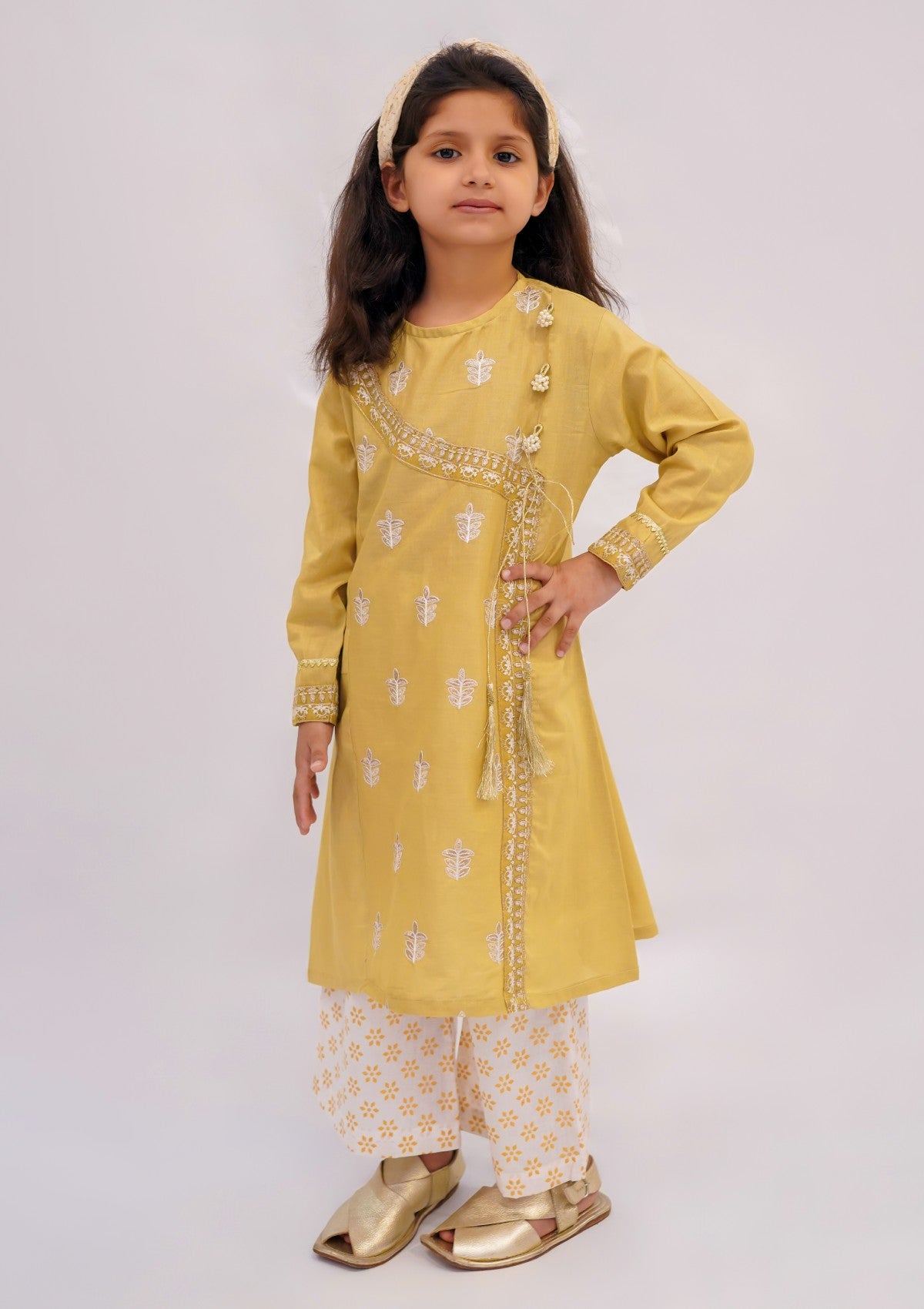 This exquisite fawn angrakha features intricate white and golden tilla embroidery, beautifully paired with a white flapper adorned with elegant golden screen printing. A perfect blend of tradition and contemporary style.