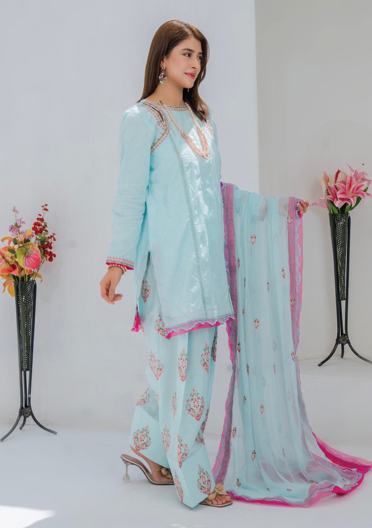 Step into elegance with this pastel mint three-piece unstitched suit, adorned with delicate floral embroidery and soft pink accents. Featuring a solid dyed shirt, an intricately embroidered Farshi shalwar, and a sheer dupatta that shimmers with movement, this ensemble beautifully blends tradition with charm.
