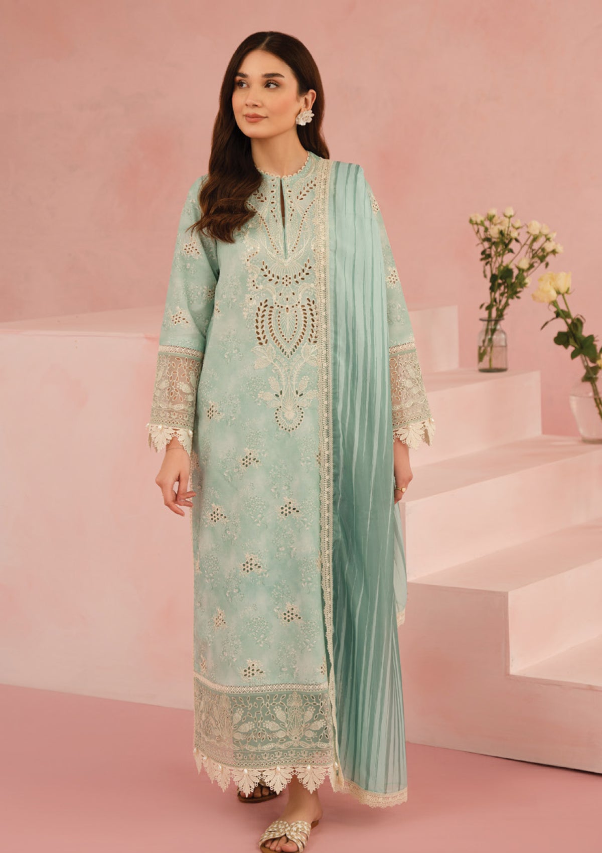 This apple green three-piece ensemble blends modern sophistication with luxury. Sleek embroidery, organza patches, and a contrast printed silk dupatta create a dynamic, chic look, perfect for elegant events.
