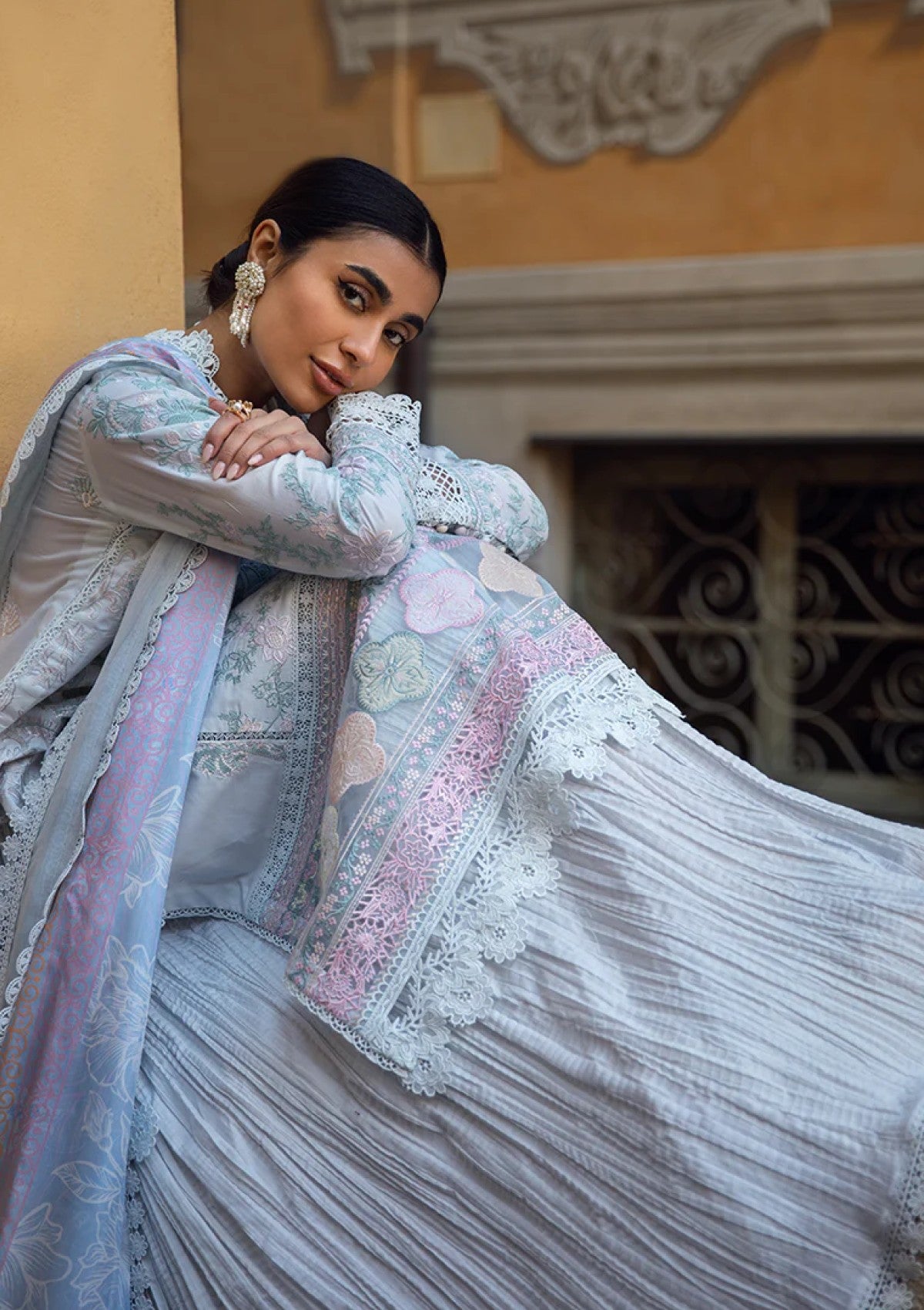 This design combines Moroccan appliqué motifs with abstract embroidered florals on a serene light blue base. Pastel pink, green, and yellow tones add softness, while the silk dupatta enhances its elegant, timeless appeal.