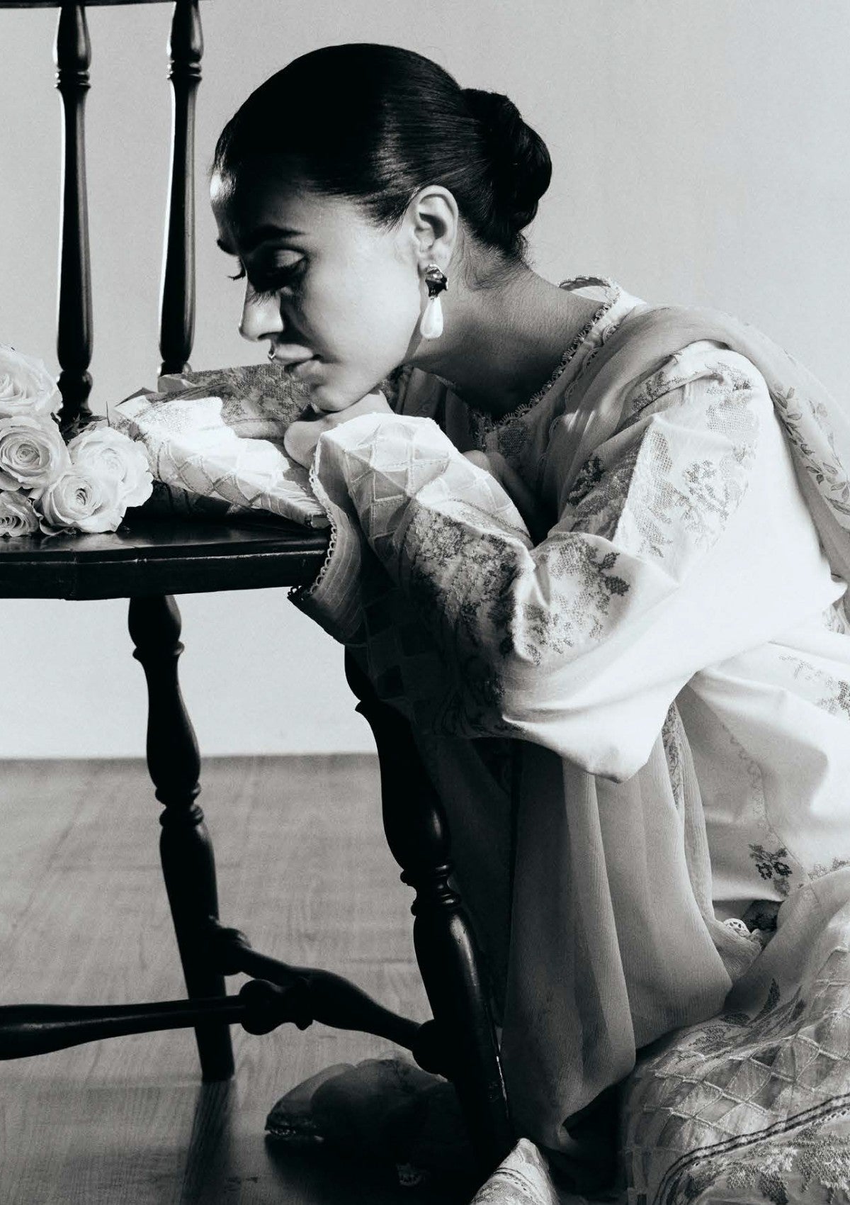 A pearl white light jacquard shirt adorned with powder blue and yellow florals and a breezy chiffon dupatta—this unstitched set brings a touch of quiet romance to summer dressing.