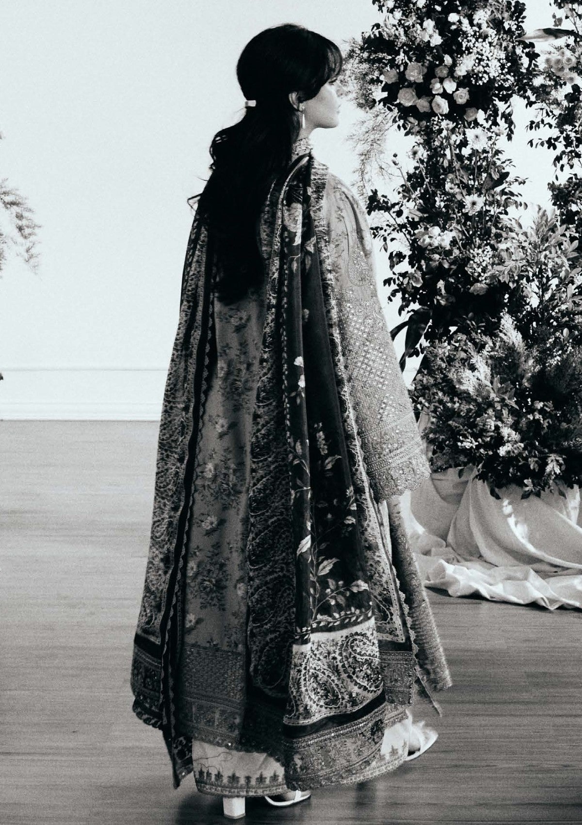 Printed florals on slate grey meet sky-blue embroidery and a deep navy silk dupatta—this unstitched set is an ode to quiet depth and everyday grace.