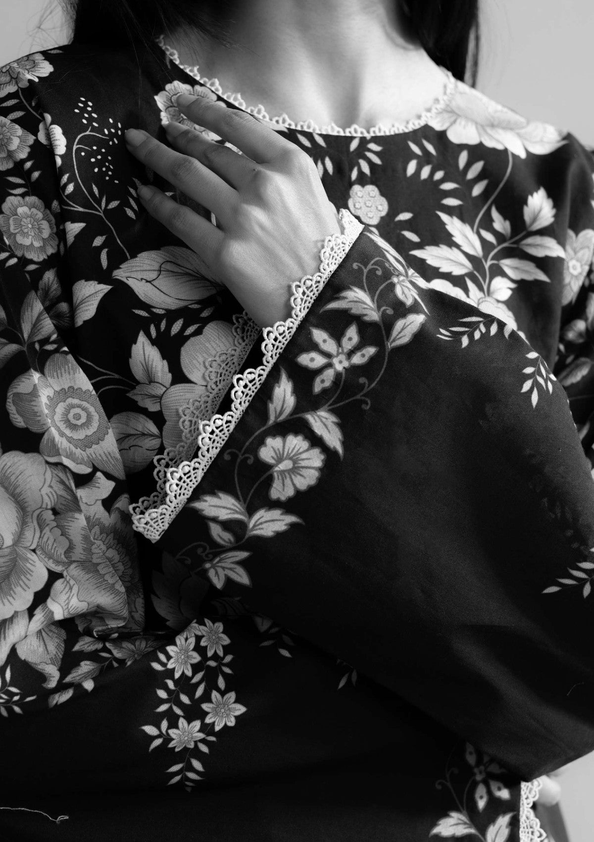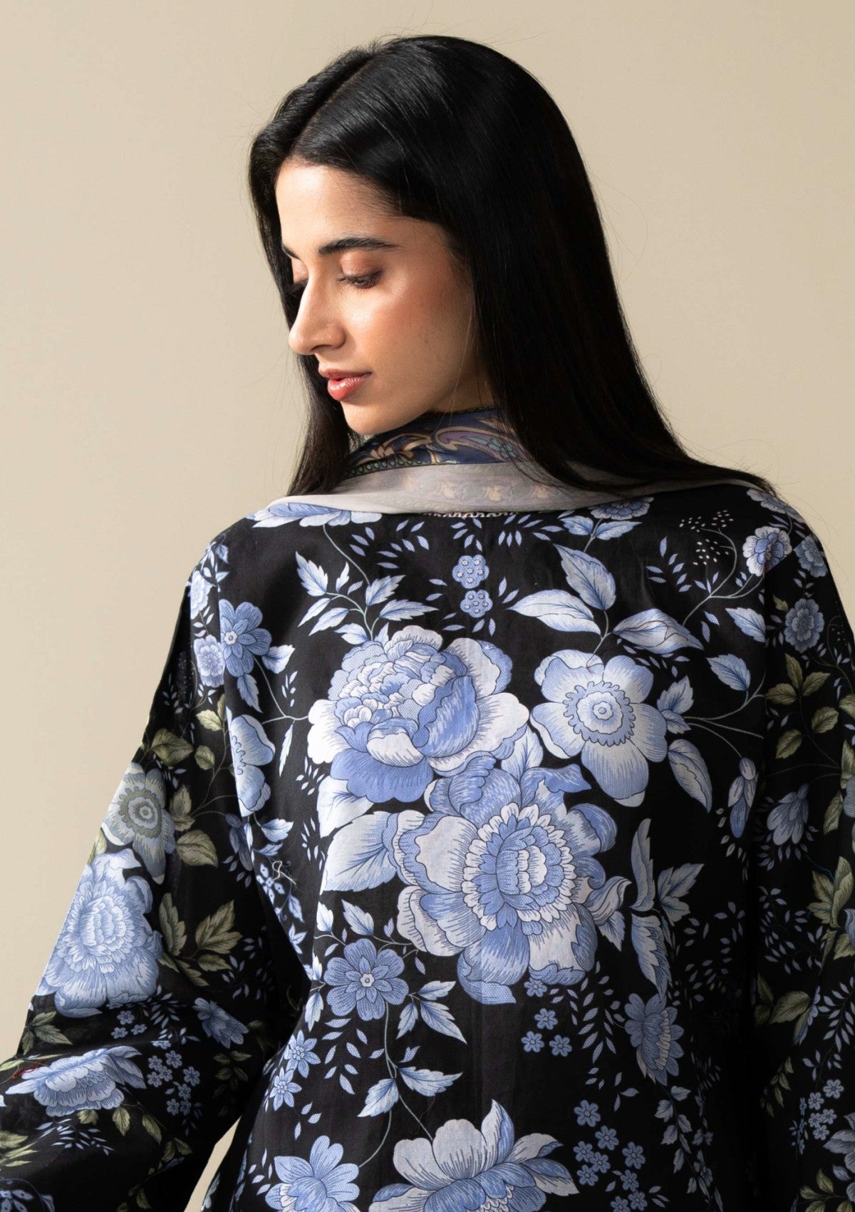 A botanical blue print on a black base with all-over floral printed pants, finished with a breezy chiffon dupatta moody, bold, and beautifully detailed.