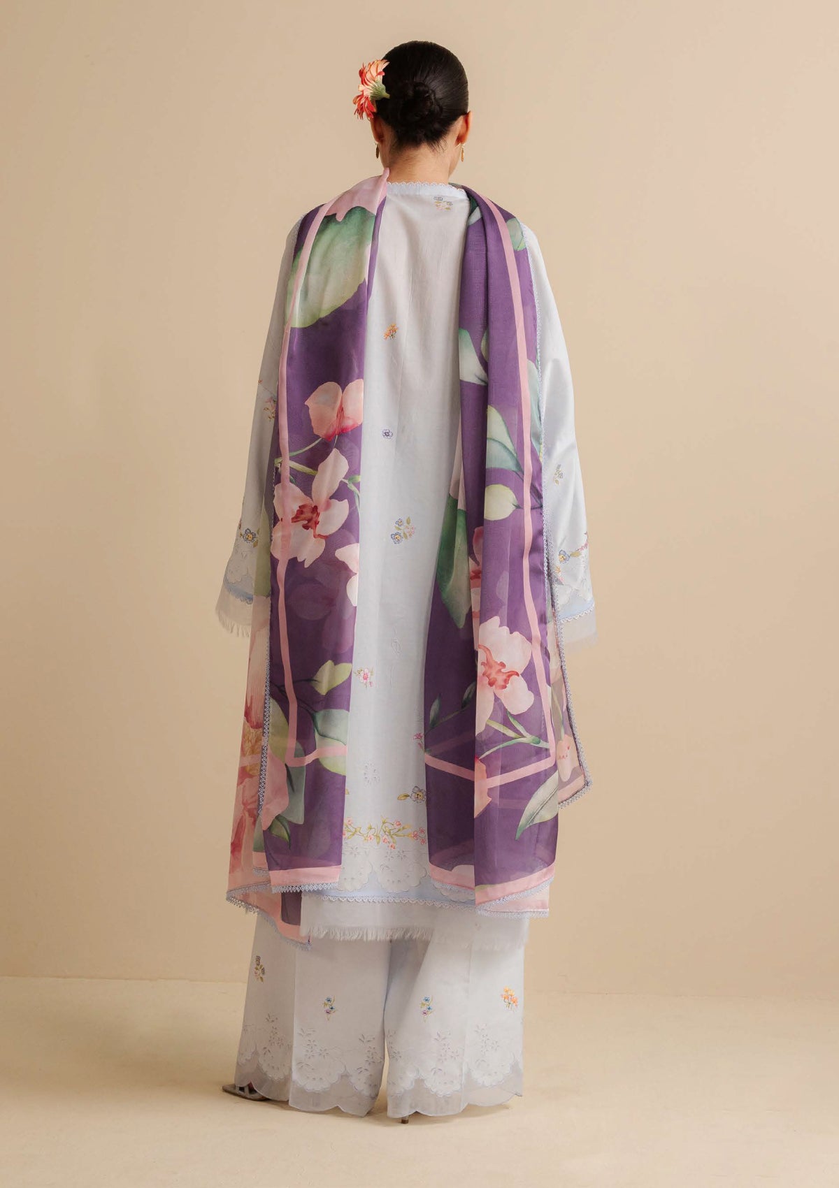 A soft powder blue shirt adorned with delicate pastel florals pairs seamlessly with matching embroidered trousers, while the statement dupatta bursts with bold, oversized blooms in rich purples and pinks.