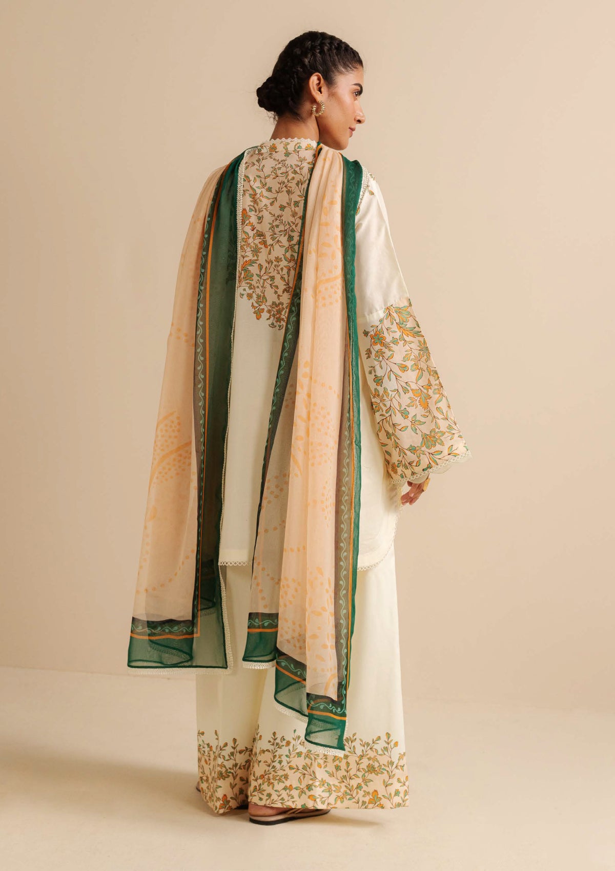 A breezy printed shirt with tonal embroidery, styled with crisp trousers with heavy border and a dreamy light shade dupatta in blended hues.