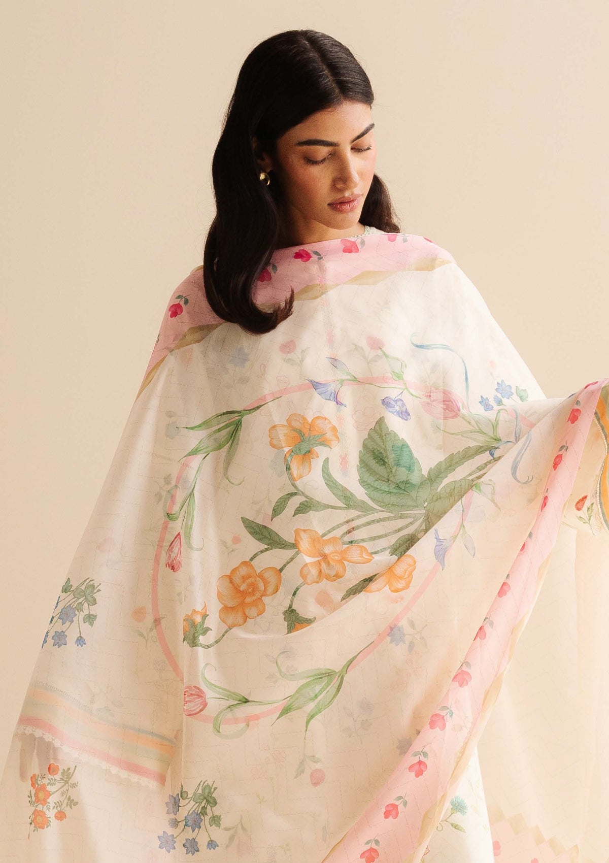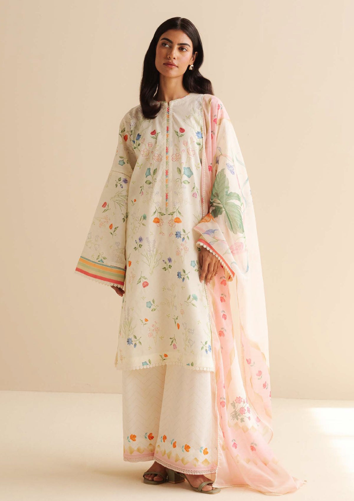 A minty fresh shirt with scattered florals, coordinated with tonal trousers and a blush-hued dupatta for a light, summery charm.