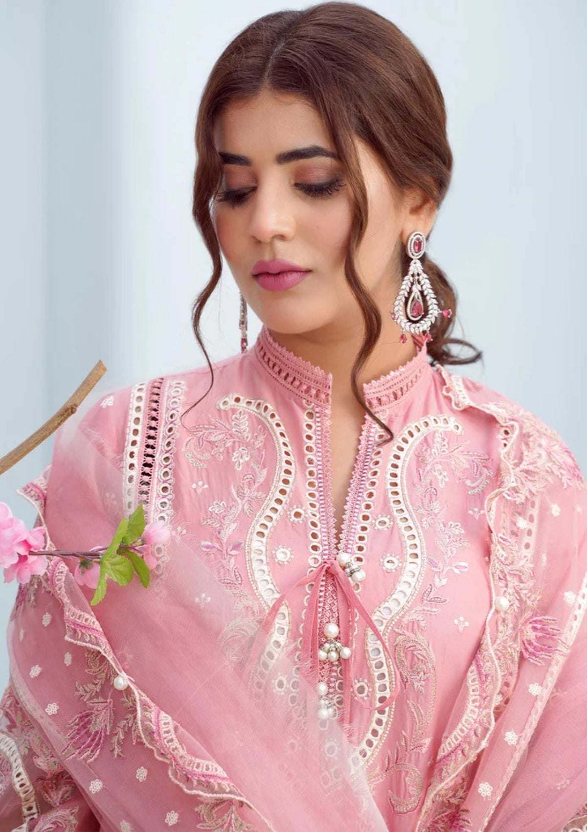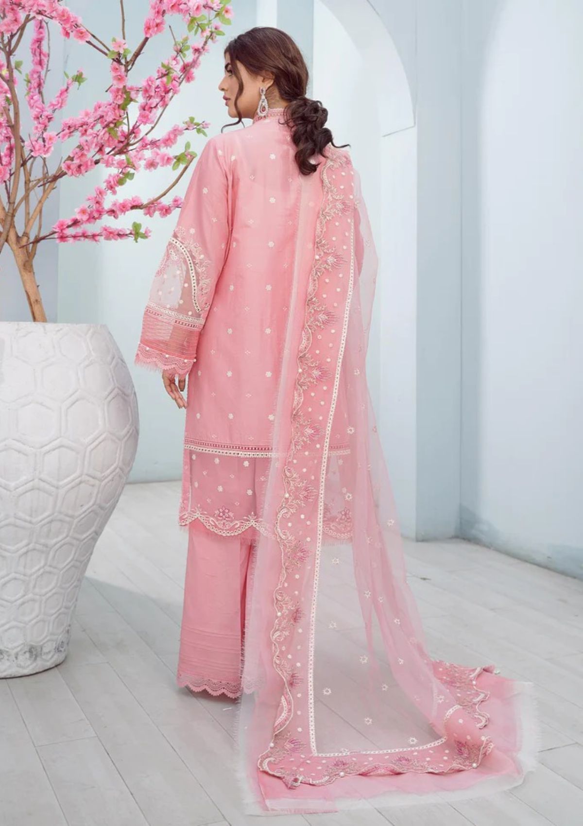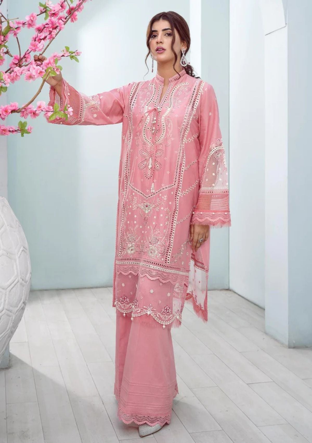 Description: The Asimah. K's Inayat collection brings you a beautiful tea pink premium lawn fabric outfit, featuring the stunning Dahlia design. The shirt is adorned with an intricately embroidered center panel, with matching embroidery on the right and left side panels, sleeves, and back. The front and back borders are also embroidered, adding to the overall intricate design. The net dupatta is beautifully embroidered, with embroidered borders on all four sides. The outfit is completed with solid-dyed cambric trousers, making it a perfect choice for any occasion.