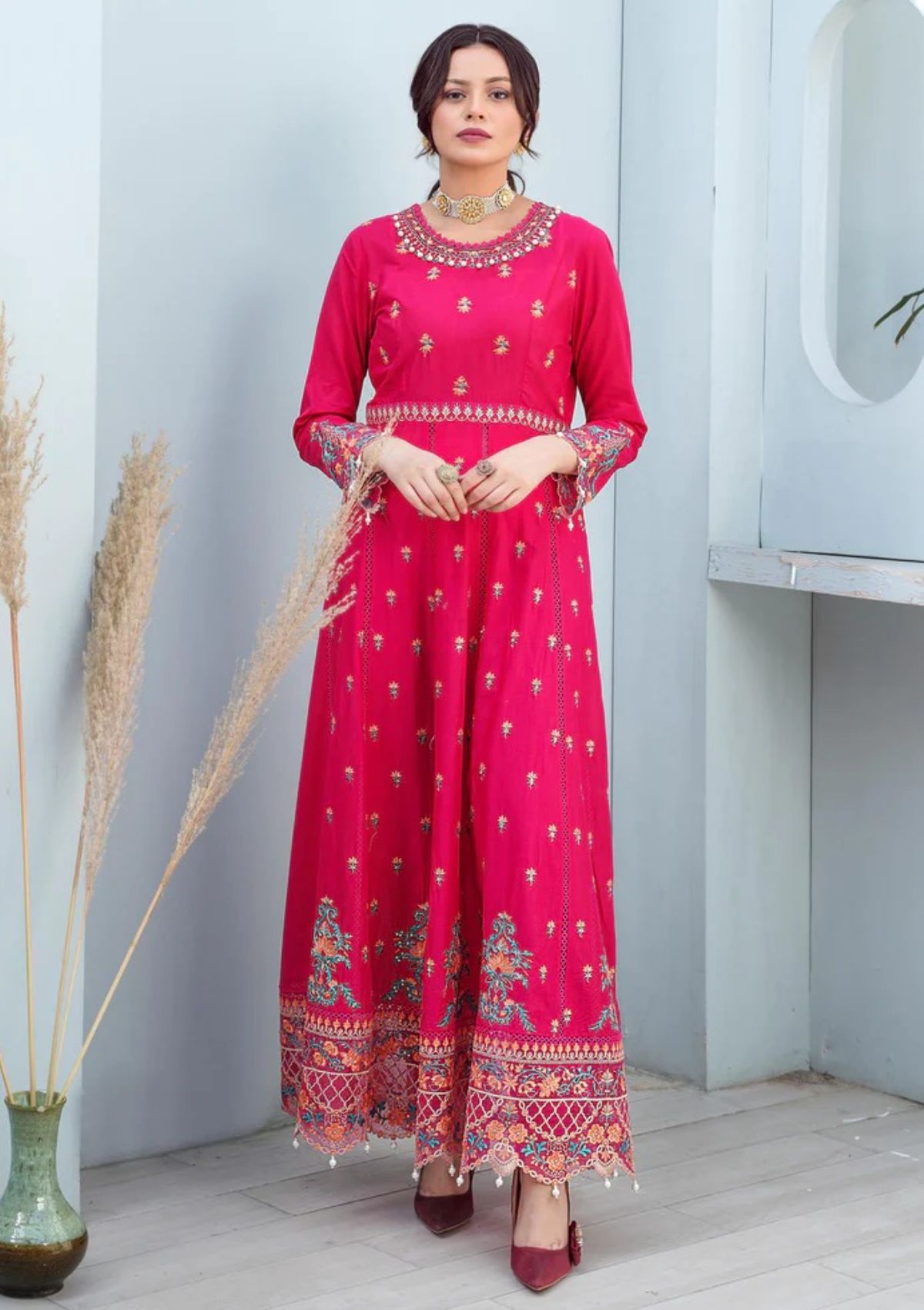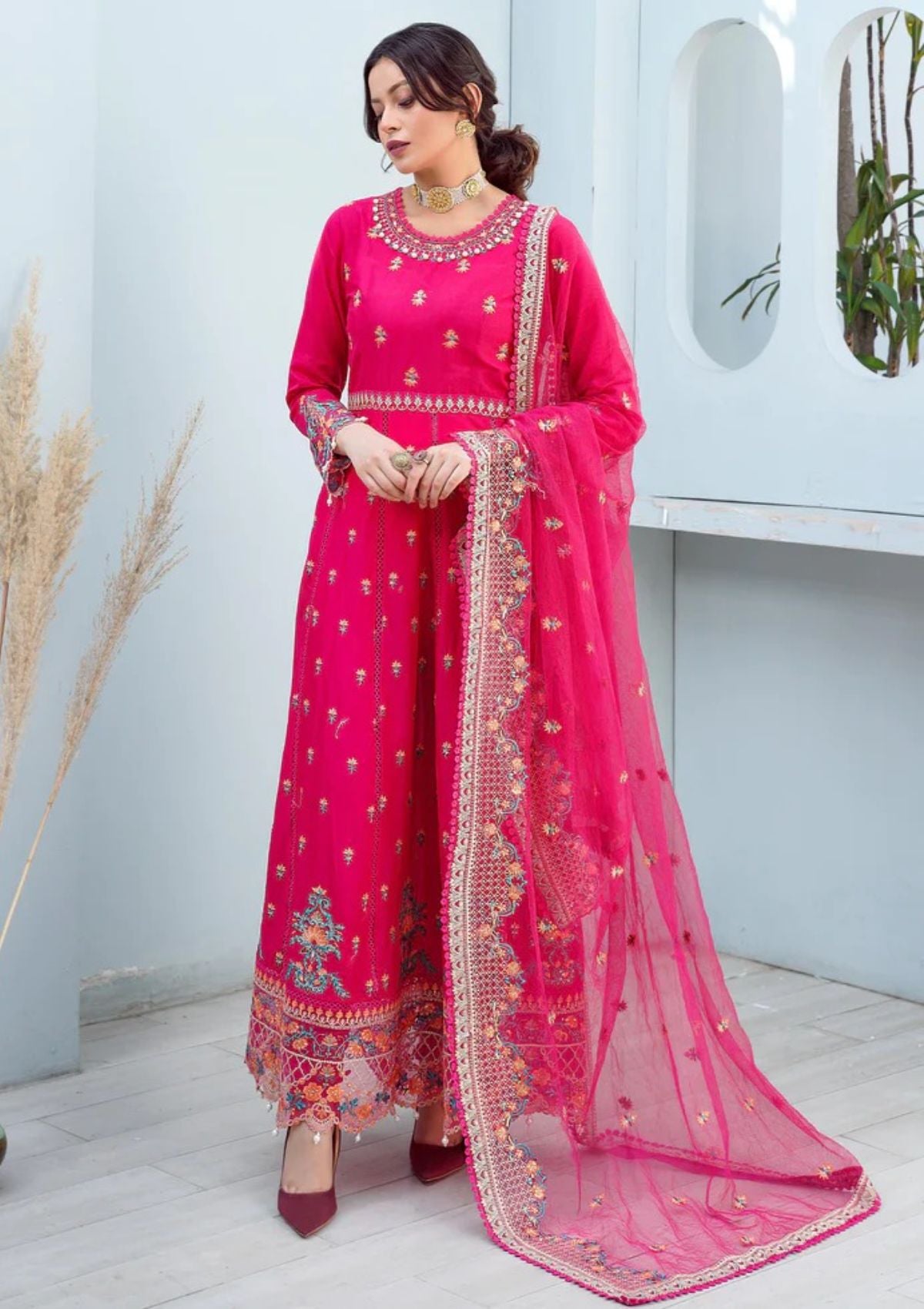 Description: This dress is a part of the Asimah.k Inayat collection and comes in a vibrant shocking pink color. Made with premium lawn fabric, the design is named Rose and features Front Embroidered Panels, Back Plain Panels made of fabric, and Front and Back Daman Border Embroidery. The Front and Back Body are also embroidered with a matching border. The dress has a simple neckline and the sleeves are made of plain fabric with embroidered borders. It comes with a beautiful Net Dupatta that is also embroidered.