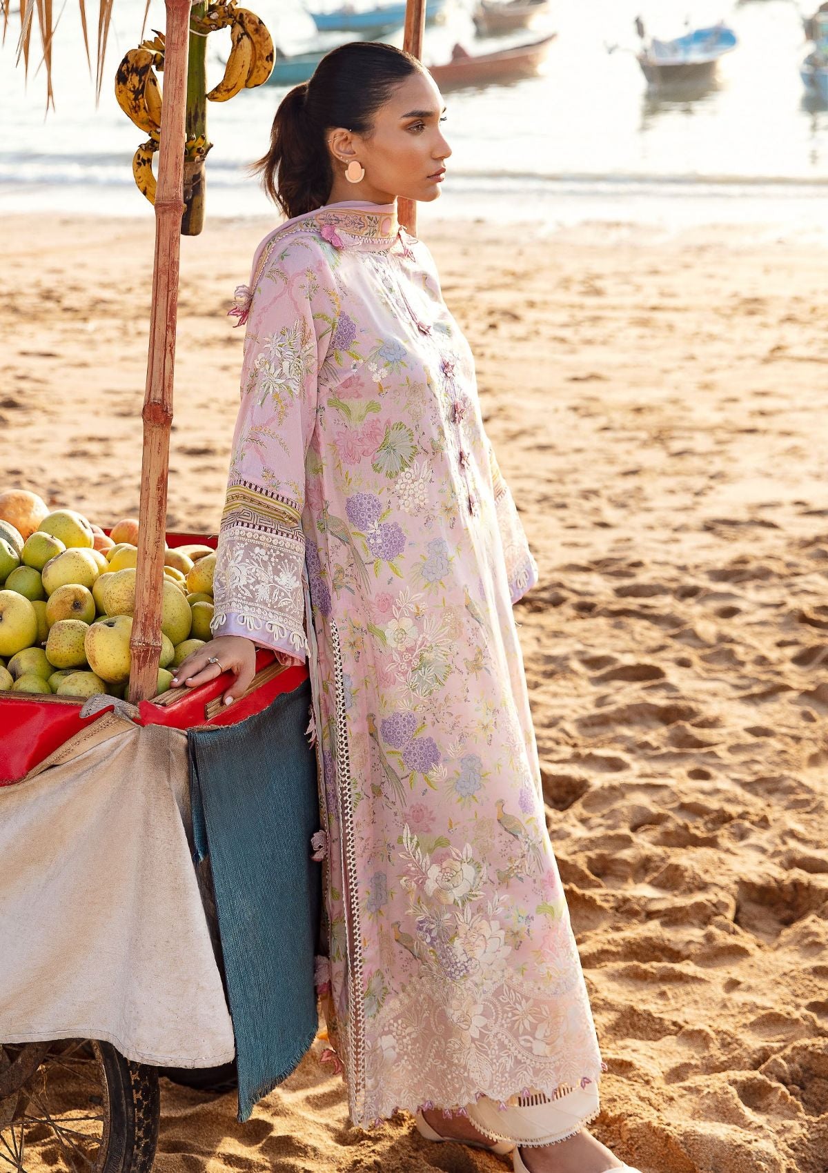 Description: Soft pink gleams with wistful ivory embroideries layered over a blissful flora and fauna print blooming to depict soothing shades of lilac, cyan, sage and berry in ‘Lia.’ With an embroidered festoon swirling on the neckline and sleeves, this ultra feminine design comes paired with a pretty, chiffon dupatta and tonal trousers to curate a look that has all the right ingredients to ensure you keep your cool during the hot and steamy summer days.