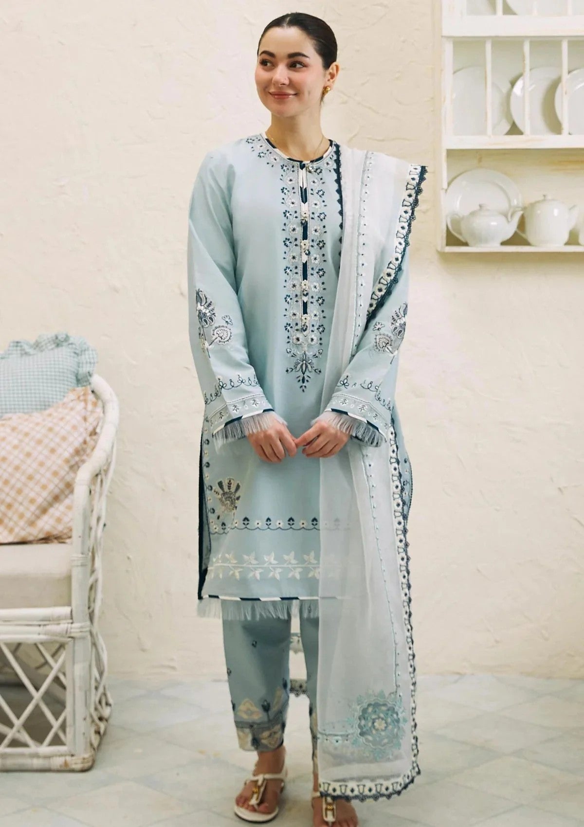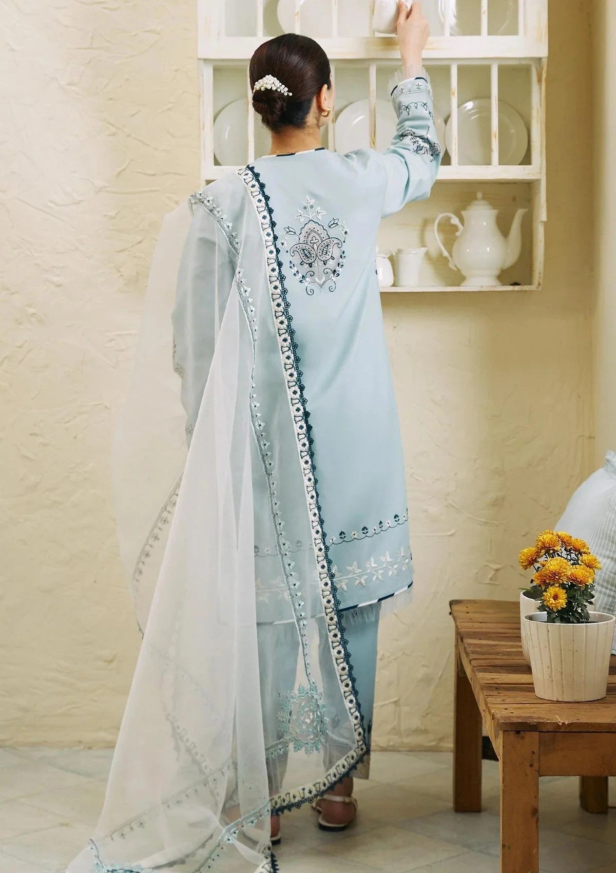 • Embroidered Organza dupatta 2.75 Yards Embroidered Dupatta Patti 2.8 Yards Embroidered Dupatta Motif 4 Pcs Embroidered Front Back 2 Yards Embroidered Sleeve 0.7 Yard Embroidered Neck 1 Pc Embroidered Back Motif 1 Pc Embroidered Motif 2 Pcs Embroidered Motif 2 Pcs Embroidered Border 2.5 Yards Embroidered Trouser Border 1.4 Yards Embroidered Cambric Trouser 2.15 Yards